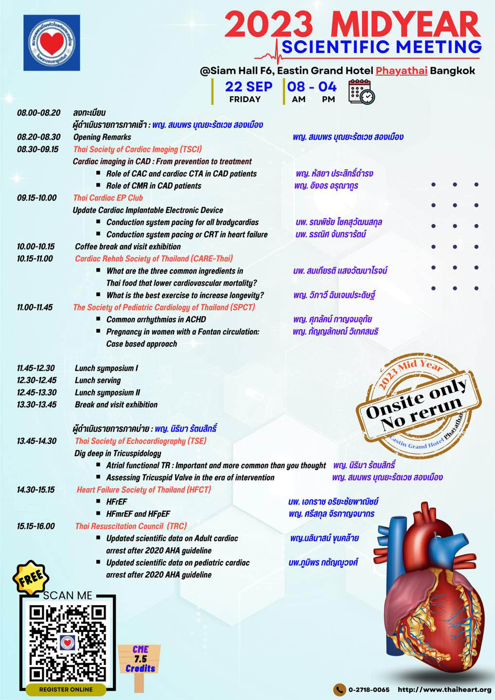 สมาคมแพทย์โรคหัวใจแห่งประเทศไทย จัดการประชุมวิชาการกลางปี 2566 (2023 MIDYEAR SCIENTIFIC MEETING) ในวันที่ 22 กันยายน 2566 ณ ห้องประชุม Siam Hall ชั้น 6 Eastin Grand Hotel Phayathai Bangkok เวลา 08.00 – 16.00 น.