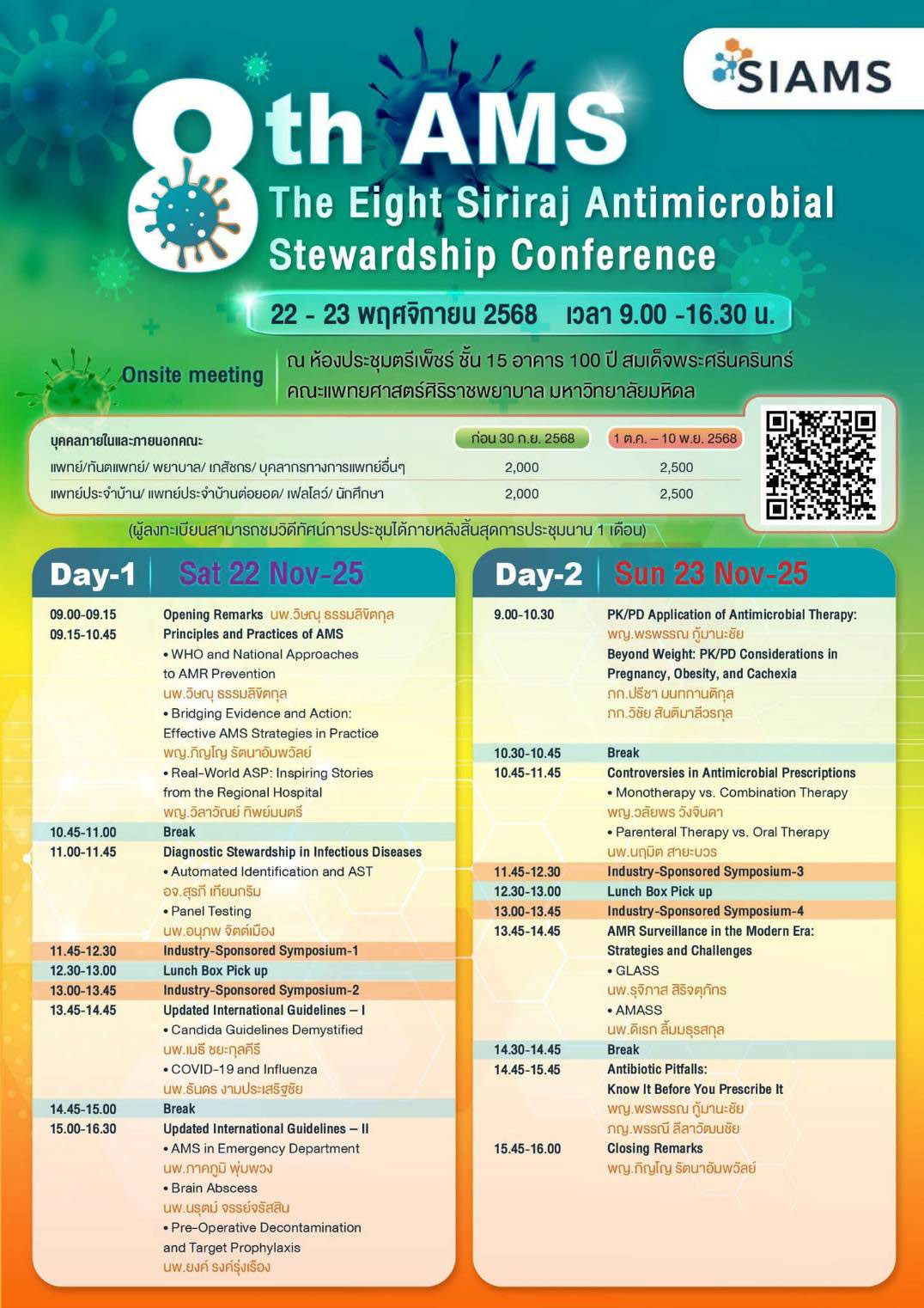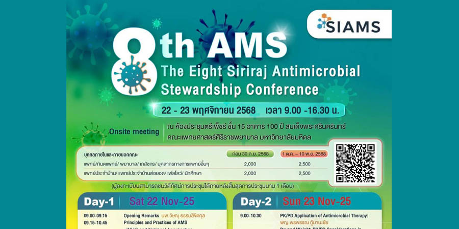 สาขาวิชาโรคติดเชื้อและอายุรศาสตร์เขตร้อน ภาควิชาอายุรศาสตร์ คณะแพทยศาสตร์ศิริราชพยาบาล มหาวิทยาลัยมหิดล จัดการประชุมวิชาการโครงการอบรมระยะสั้น เรื่อง The Eight Siriraj Antimicrobial Stewardship (8th AMS) Conference วันที่ 22-23 พฤศจิกายน 2568 เวลา 09.00-16.30 น. ณ ห้องประชุมตรีเพ็ชร์ ชั้น 15 อาคาร 100 ปี สมเด็จพระศรีนครินทร์ คณะแพทยศาสตร์ศิริราชพยาบาล มหาวิทยาลัยมหิดล