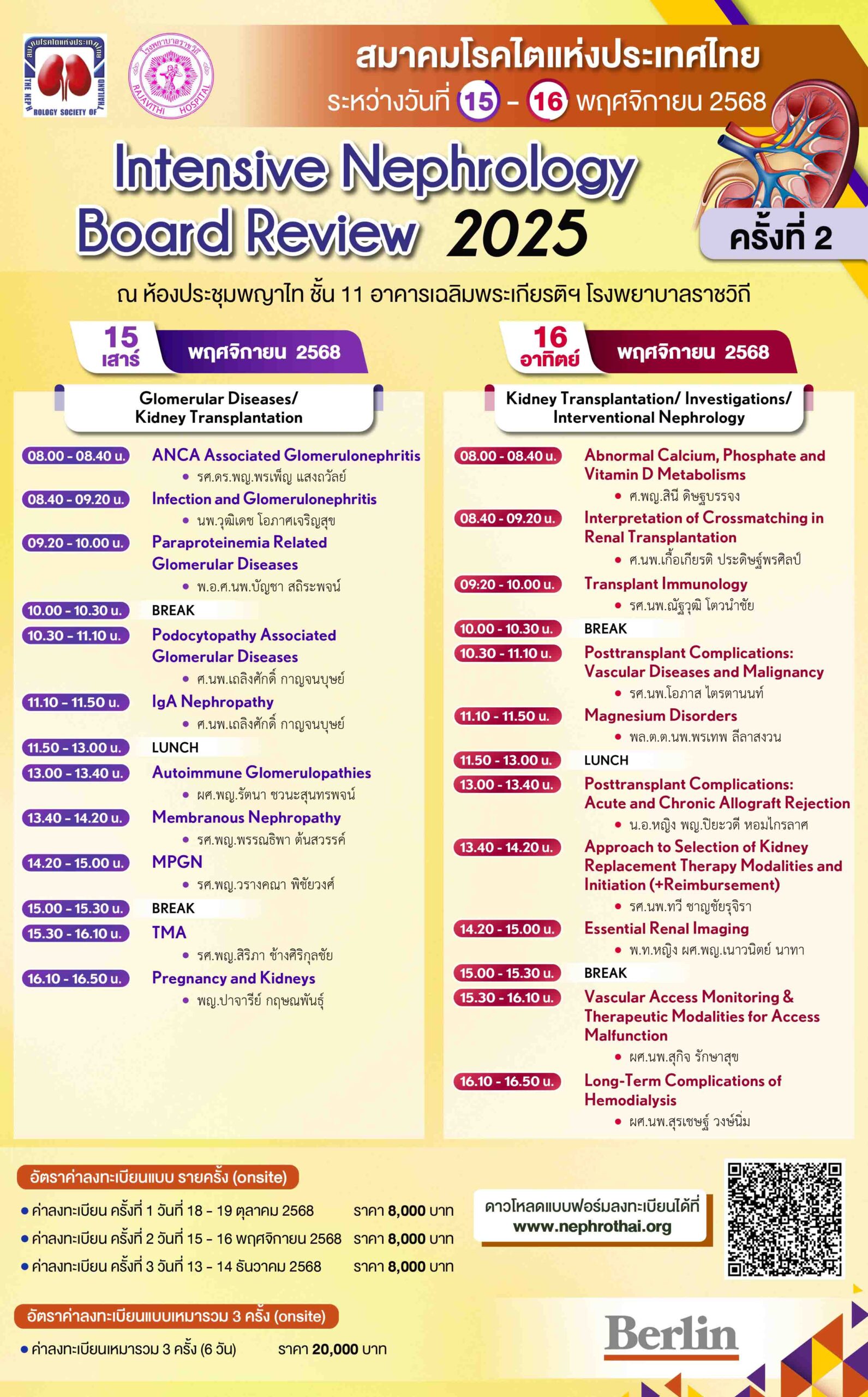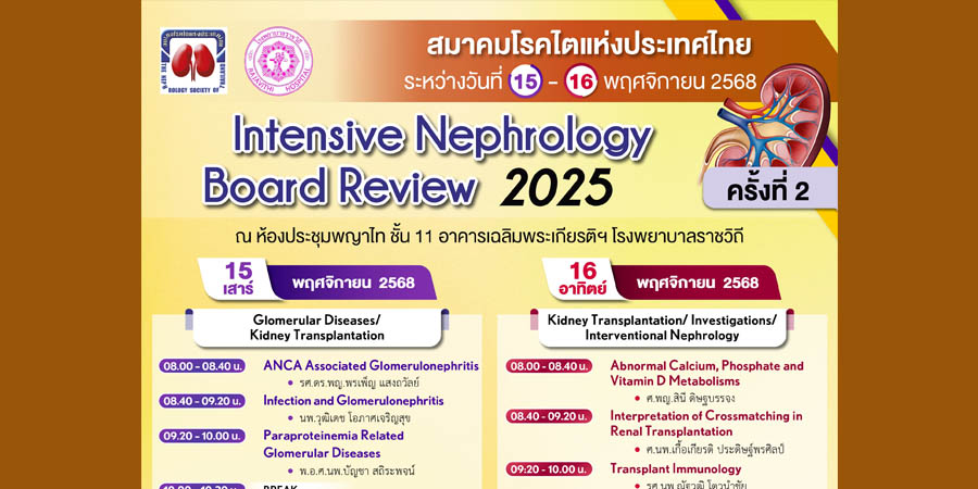 สมาคมโรคไตแห่งประเทศไทย ร่วมกับโรงพยาบาลราชวิถี จัดการอบรมวิชาการ Intensive Nephrology Board Review 2025 ครั้งที่ 2 ระหว่างวันที่ 15-16 พฤศจิกายน 2568 ณ ห้องประชุมพญาไท ชั้น 11 อาคารเฉลิมพระเกียรติฯ โรงพยาบาลราชวิถี