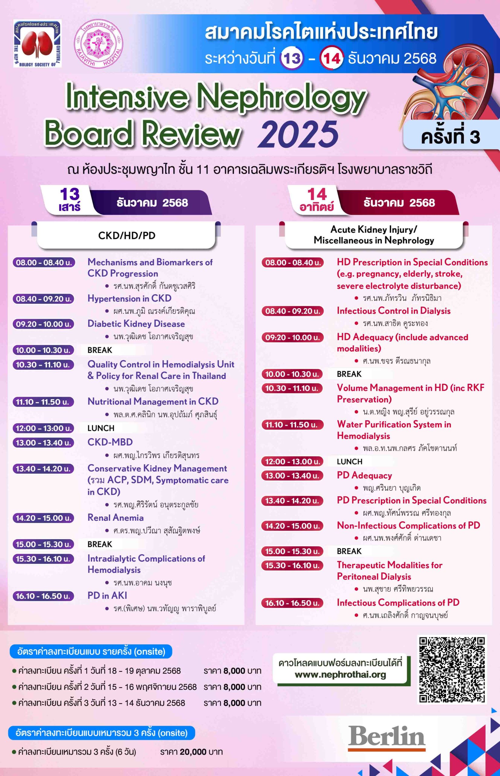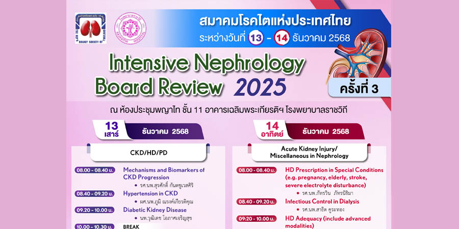 สมาคมโรคไตแห่งประเทศไทย ร่วมกับโรงพยาบาลราชวิถี จัดการอบรมวิชาการ Intensive Nephrology Board Review 2025 ครั้งที่ 3 ระหว่างวันที่ 13-14 ธันวาคม 2568 ณ ห้องประชุมพญาไท ชั้น 11 อาคารเฉลิมพระเกียรติฯ โรงพยาบาลราชวิถี