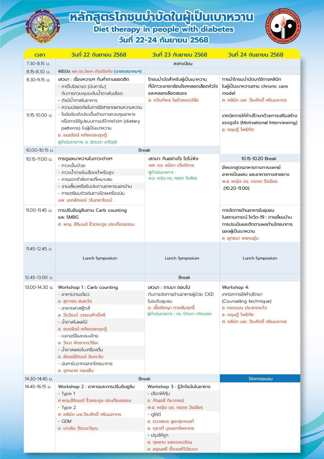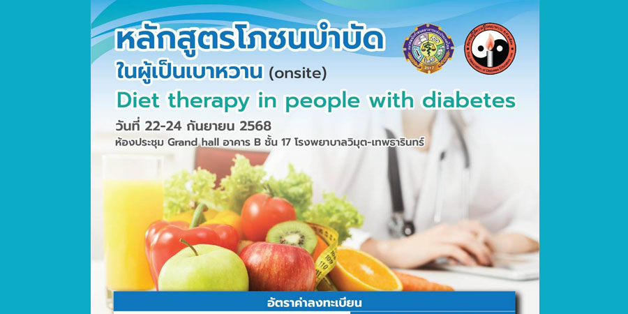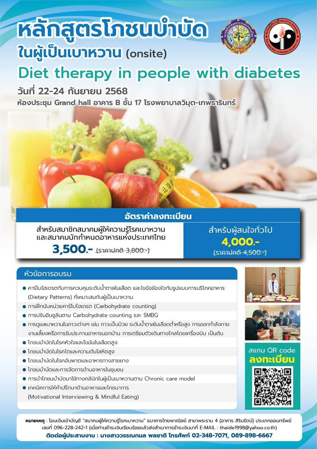 สมาคมผู้ให้ความรู้โรคเบาหวานร่วมกับสมาคมนักกำหนดอาหารแห่งประเทศไทย จัดการอบรม หลักสูตรโภชนบำบัดในผู้เป็นเบาหวาน “Diet therapy in people with diabetes” วันที่ 22-24 กันยายน 2568  ณ ห้องประชุม Grand hall  อาคาร B ชั้น 17 โรงพยาบาลวิมุต-เทพธารินทร์
