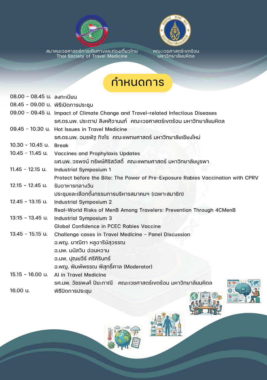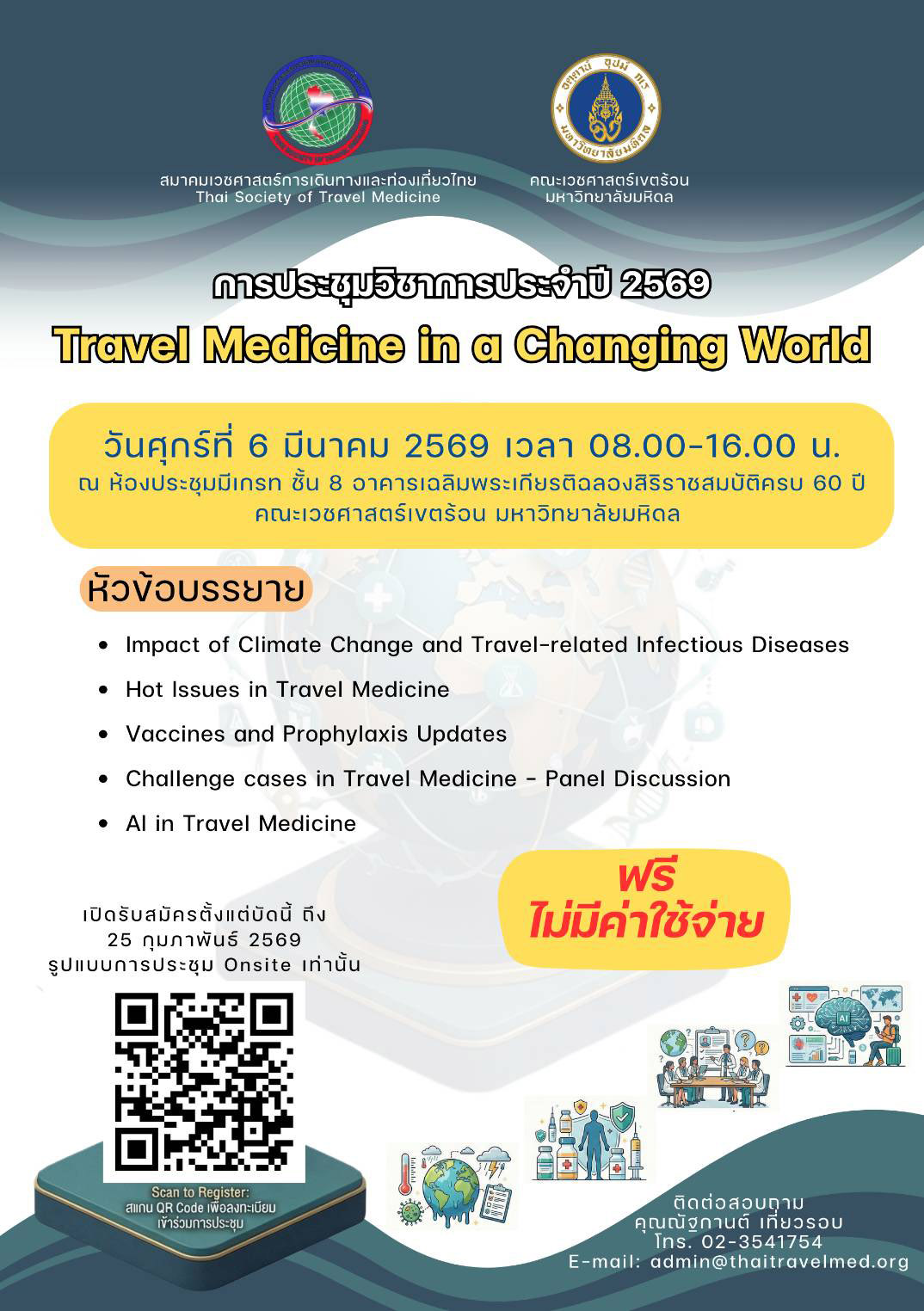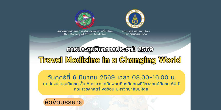 สมาคมเวชศาสตร์การเดินทางและท่องเที่ยวไทย ร่วมกับ คณะเวชศาสตร์เขตร้อน มหาวิทยาลัยมหิดล จัดการประชุมวิชาการประจำปี 2569 Travel Medicine in a Changing World ในวันศุกร์ที่ 6 มีนาคม 2569 เวลา 08.00-16.00 น. ณ ห้องประชุมมีเกรท ชั้น 8 อาคารเฉลิมพระเกียรติฉลองสิริราชสมบัติครบ 60 ปี คณะเวชศาสตร์เขตร้อน มหาวิทยาลัยมหิดล