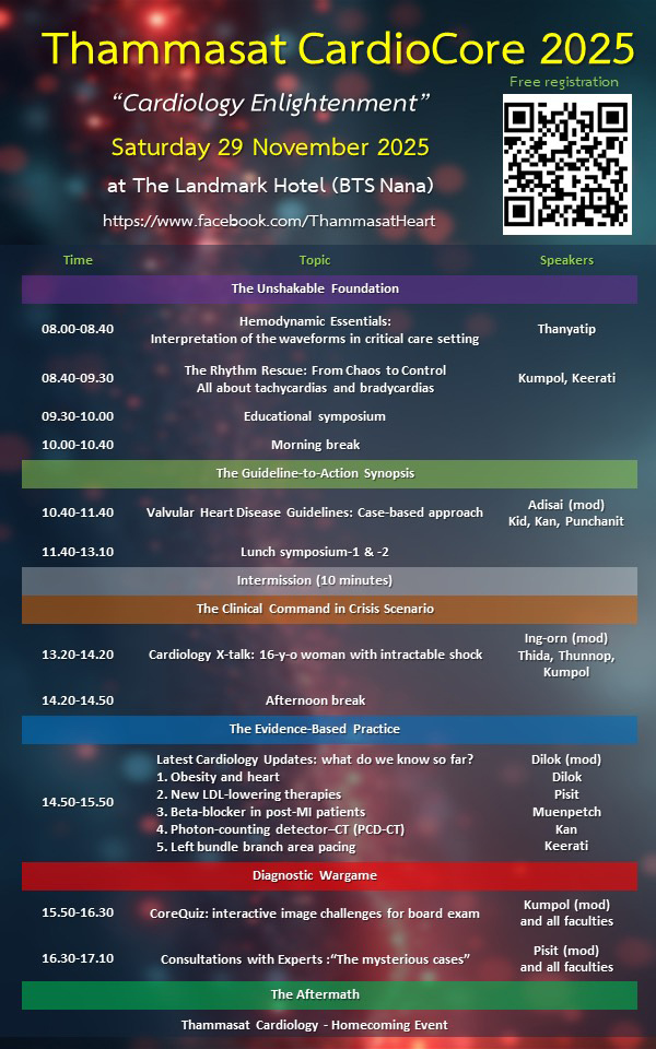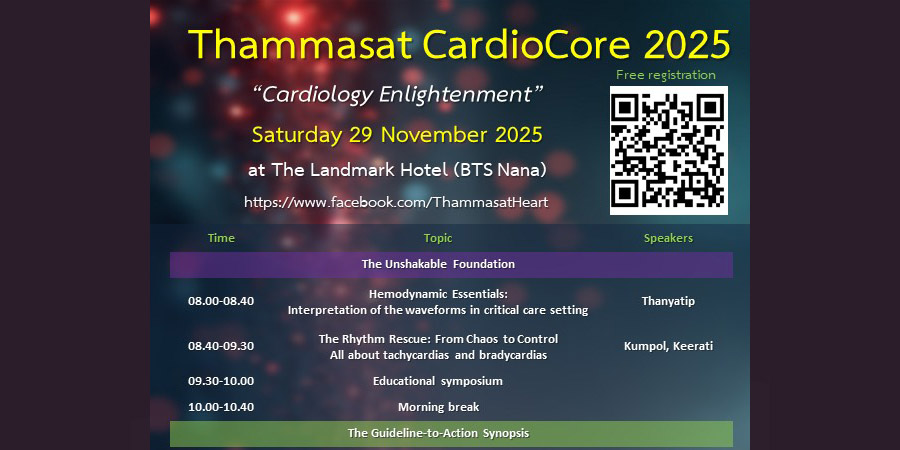 หน่วยโรคหัวใจ มหาวิทยาลัยธรรมศาสตร์ จัดการประชุมวิชาการประจำปี 2568 CardioCORE 2025 : Cardiology Enlightenment ในวันเสาร์ที่ 29 พฤศจิกายน 2568 ตั้งแต่เวลา 08.00-17.00 น. ณ โรงแรมแลนด์มาร์ค สุขุมวิท