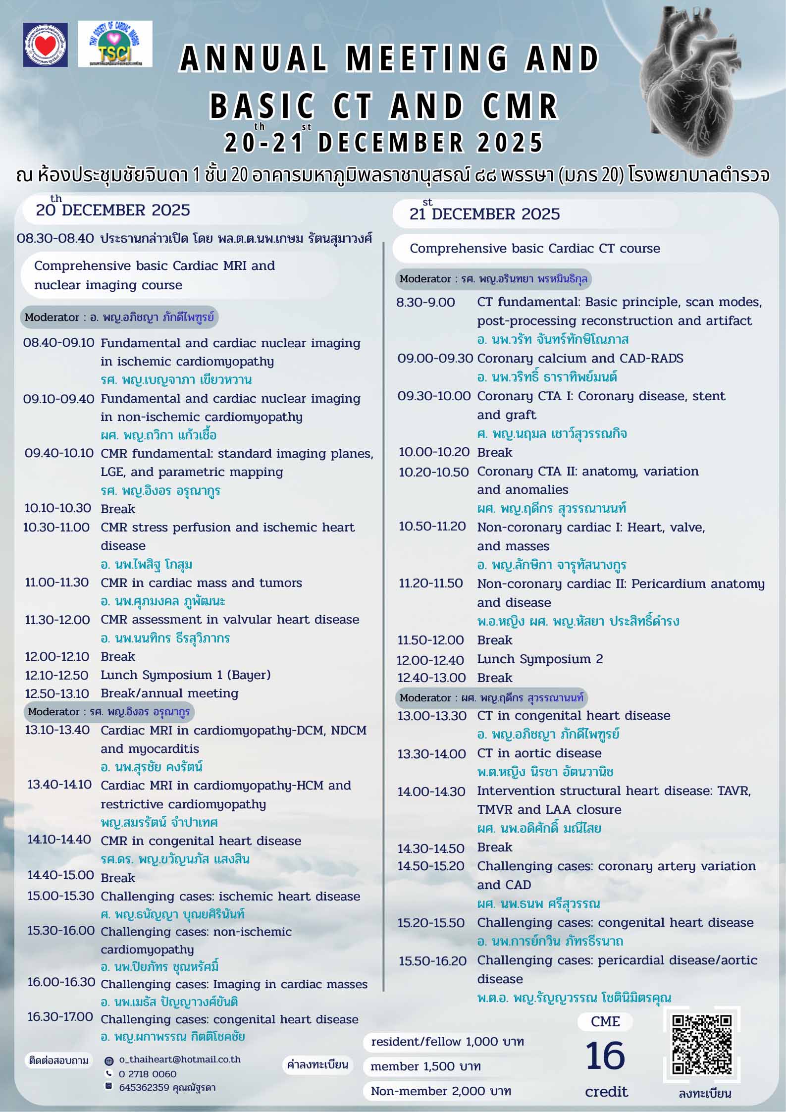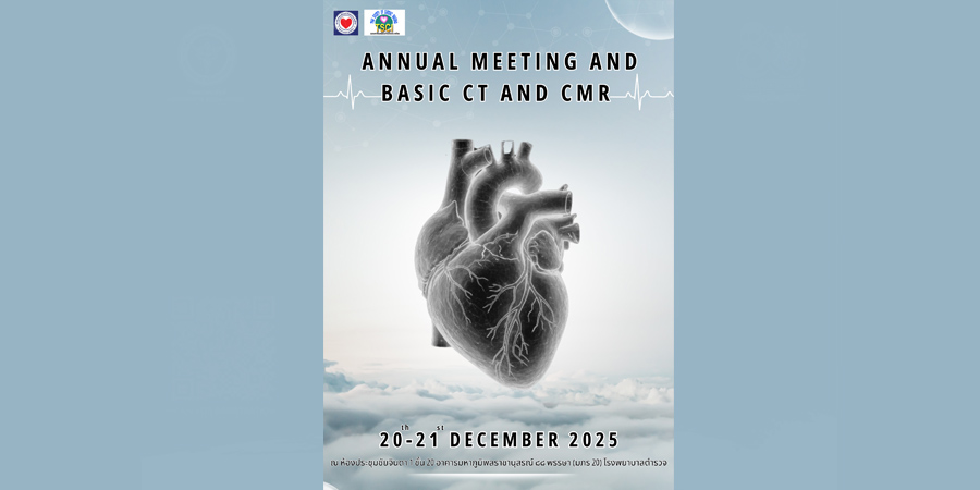 ชมรมคาร์ดิแอคอิมเมจจิงแห่งประเทศไทย ภายใต้สมาคมแพทย์โรคหัวใจแห่งประเทศไทย ฯ จัด Annual Meeting and Basic CT and CMR ในวันเสาร์ที่ 20 -อาทิตย์ที่ 21 ธันวาคม 2568 เวลา 08.30-16.30 น. ณ ห้องประชุมชัยจินดา 1 ชั้น 20 อาคารมหาภูมิพลราชานุสรณ์ ๘๘ พรรษา (มภร 20) โรงพยาบาลตำรวจ