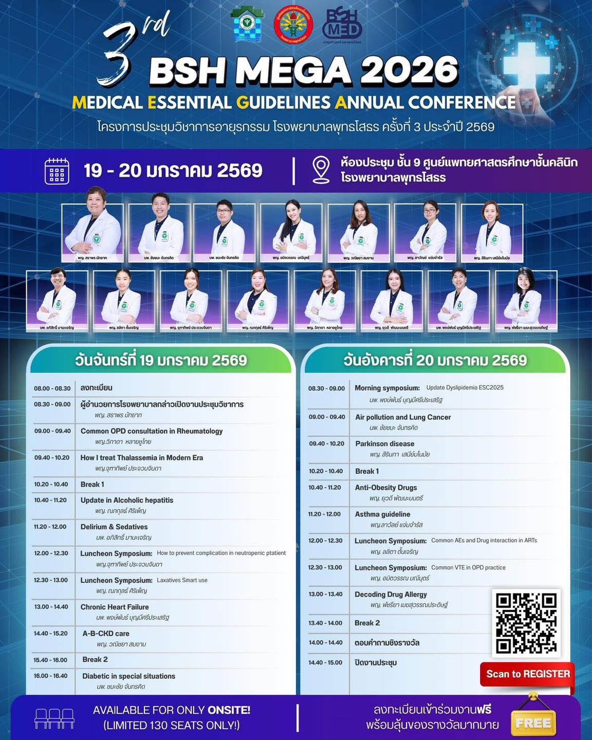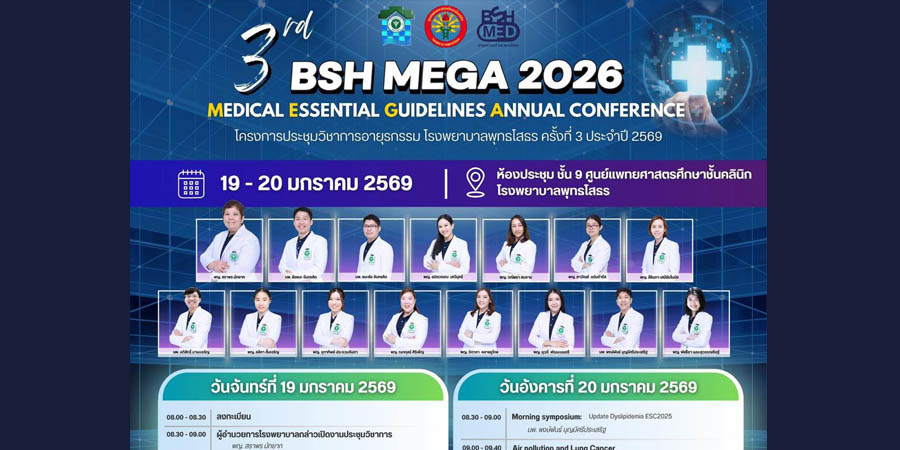 โครงการประชุมวิชาการอายุรกรรม โรงพยาบาลพุทธโสธร ครั้งที่ 3 ประจำปี 2569 Medical Essential Guidelines Annual Conference ระหว่างวันจันทร์ที่ 19 – วันอังคารที่ 20 มกราคม 2569 เวลา 08.30-16.30 น. ณ ห้องประชุม ชั้น 9 ศูนย์แพทยศาสตร์ศึกษาชั้นคลินิก โรงพยาบาลพุทธโสธร