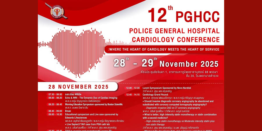 ศูนย์โรคหัวใจ กลุ่มงานอายุรกรรม โรงพยาบาลตำรวจ สำนักงานตำรวจแห่งชาติ จัดการประชุมวิชาการ 12th Police General Hospital Cardiology Conference:  Where the Heart of Cardiology Meets the Heart of Serviceในวันศุกร์ที่ 28 และวันเสาร์ที่ 29 พฤศจิกายน 2568 ณ ห้องประชุมชัยจินดา 1 อาคารมหาภูมิพลราชานุสรณ์ 88 พรรษา ชั้น 20 โรงพยาบาลตำรวจ