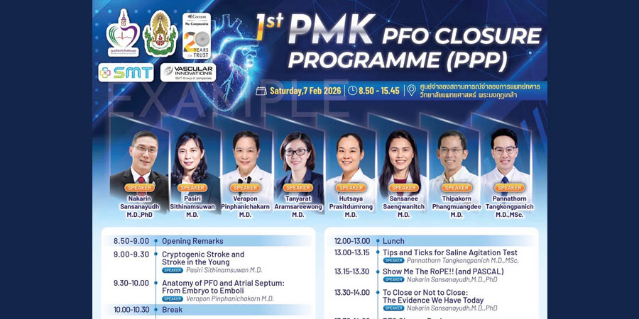 ศูนย์โรคหัวใจสิรินธร โรงพยาบาลพระมงกุฏเกล้า โดยแผนกโรคหัวใจและหลอดเลือด ร่วมกับแผนกประสาทวิทยา จัดการประชุมวิชาการ 1st PMK PFO Closure Program (PPP) ในวันเสาร์ที่ 7 กุมภาพันธ์ 2569 ณ ศูนย์ จำลองสถานการณ์จำลองการแพทย์ทหาร วิทยาลัยแพทยศาสตร์พระมงกุฎเกล้า