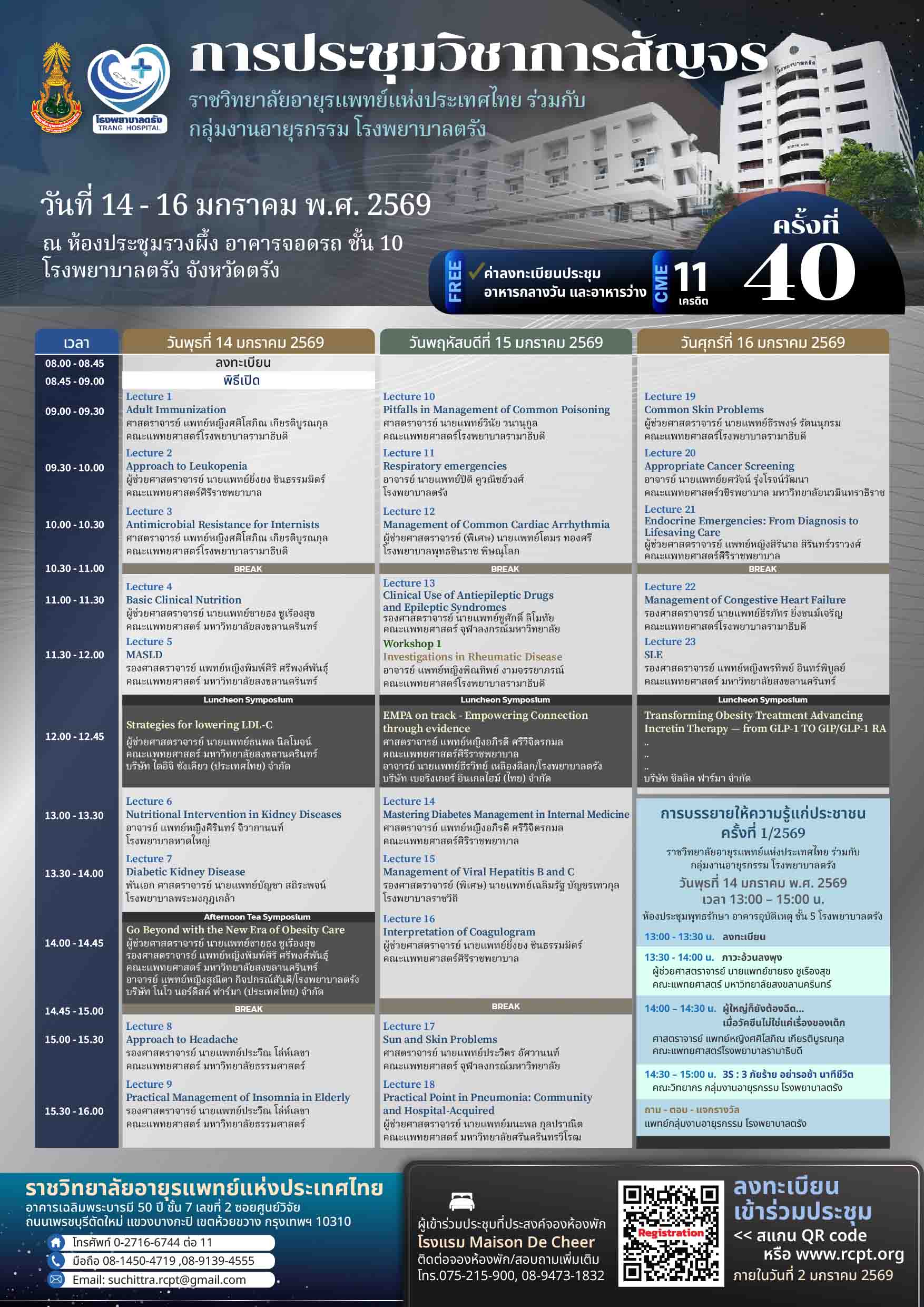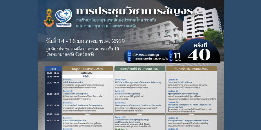 ราชวิทยาลัยอายุรแพทย์แห่งประเทศไทย ร่วมกับ กลุ่มงานอายุรกรรม โรงพยาบาลตรัง จัดการประชุมวิชาการสัญจร ครั้งที่ 40 ระหว่างวันที่ 14 – 16 มกราคม 2569 ณ ห้องประชุมรวงผึ้ง อาคารจอดรถ ชั้น 10 โรงพยาบาลตรัง จังหวัดตรัง