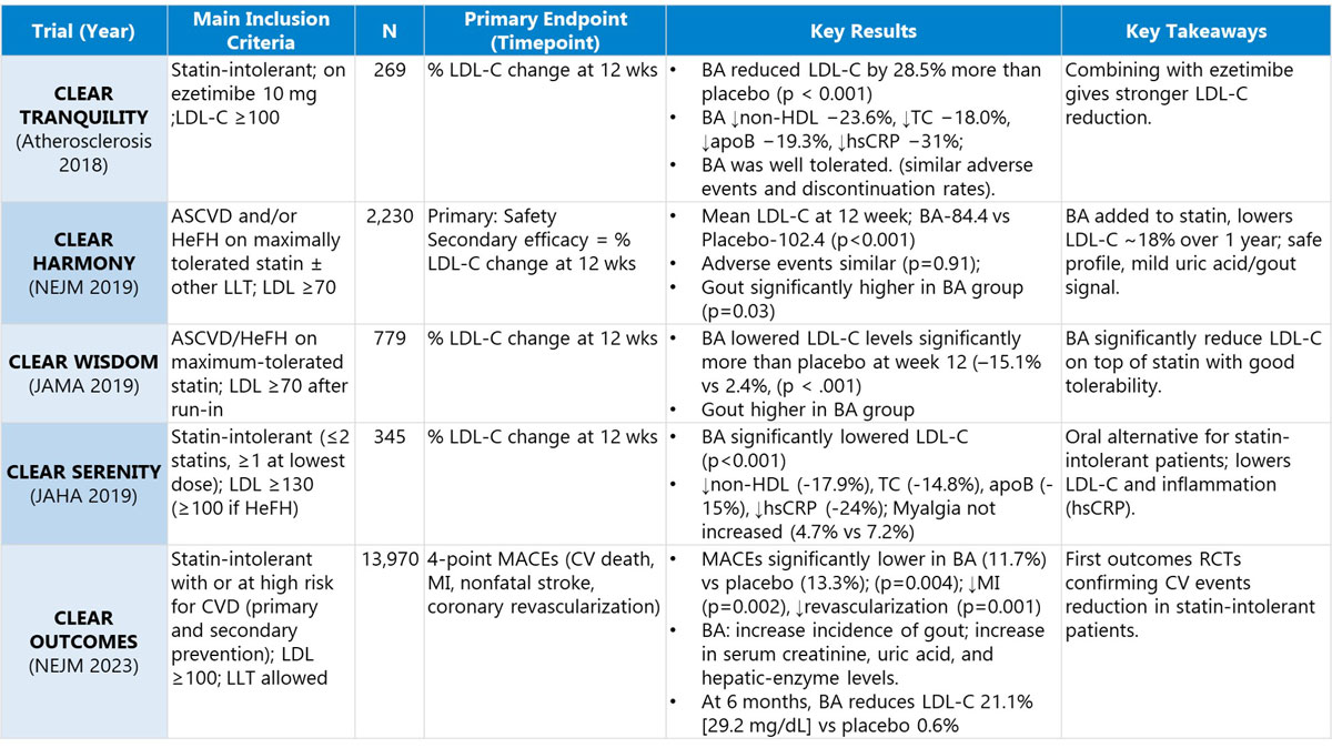 มีการศึกษาทางคลินิกที่สำคัญของ BA ที่ทำการศึกษาทั้งในรูปแบบ การป้องกันการเกิด major adverse cardiac events (MACEs) แบบปฐมภูมิ (primary prevention) และ แบบทุติยภูมิ (secondary prevention) ซึ่งผลจากการศึกษา สามารถแสดงให้เห็นถึงประสิทธิภาพในการลดระดับ LDL-C ของยา BA ทั้งในบทบาท add-on statin therapy และใช้กับกลุ่ม statin-intolerant patients ดังแสดงในตารางที่ 1 นอกจากนี้พบว่ามีรายงานอุบัติการณ์ของ การเกิด gout เพิ่มขึ้น ในกลุ่มผู้ป่วยที่ได้รับยา BA เช่นเดียวกับการเพิ่มขึ้นของระดับ serum uric acid และ serum creatinine