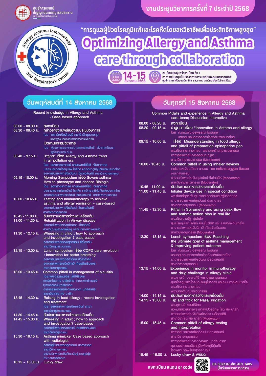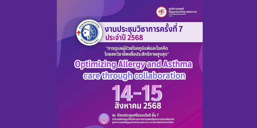 ศูนย์การแพทย์ปัญญานันทภิกขุ ชลประทาน จัดงานประชุมวิชาการครั้งที่ 7 ประจำปี 2568 ในหัวข้อ “การดูแลผู้ป่วยโรคภูมิแพ้และโรคหืดโดยสหวิชาชีพเพื่อประสิทธิภาพสูงสุด (Optimizing Allergy and Asthma care through collaboration)” ในวันที่ 14-15 สิงหาคม 2568 เวลา 08.00-16.00 น. ณ ห้องประชุมศรีธรรมโชติ ชั้น 7 อาคารสนับสนุนให้บริการทางการแพทย์และระบบสารสนเทศ ศูนย์การแพทย์ปัญญานันทภิกขุ ชลประทาน มหาวิทยาลัยศรีนครินทรวิโรฒ รูปแบบ Onsite และ Online จำกัดอย่างละ 100 ที่