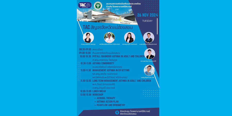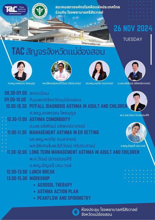 สมาคมสภาองค์กรโรคหืดแห่งประเทศไทย ร่วมกับ โรงพยาบาลศรีสังวาลย์ จัดการประชุมวิชาการ TAC สัญจรจังหวัดแม่ฮ่องสอน ในวันที่ 26 พฤศจิกายน 2567 ณ โรงพยาบาลศรีสังวาลย์ จ.แม่ฮ่องสอน