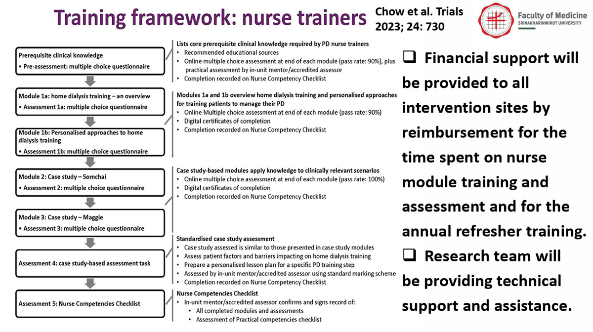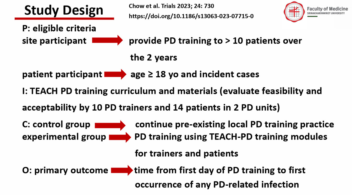 พยาบาลปฏิบ้ติการล้างไตทางช่องท้องตามแนวทางมาตรฐานที่กำหนดโดย International Society of Peritoneal Dialysis (ISPD) ต่อการติดเชื้อเยื่อบุช่องท้องในผู้ป่วยล้างไตทางช่องท้องรายใหม่เปรียบเทียบกับผลลัพธ์การดูแลผู้ป่วยจากแนวทางการฝึกอบรมแบบเดิม ในการศึกษานี้มีวัตถุประสงค์รองคือเพื่อประเมินว่าการฝึกอบรมตามแนวทางมาตรฐานที่กำหนดโดย ISPD ทำให้ผลลัพธ์การดูแลผู้ป่วยดีขึ้น และมีความคุ้มค่ากับค่าใช้จ่ายในทางเศรษฐศาสตร์สุขภาพ