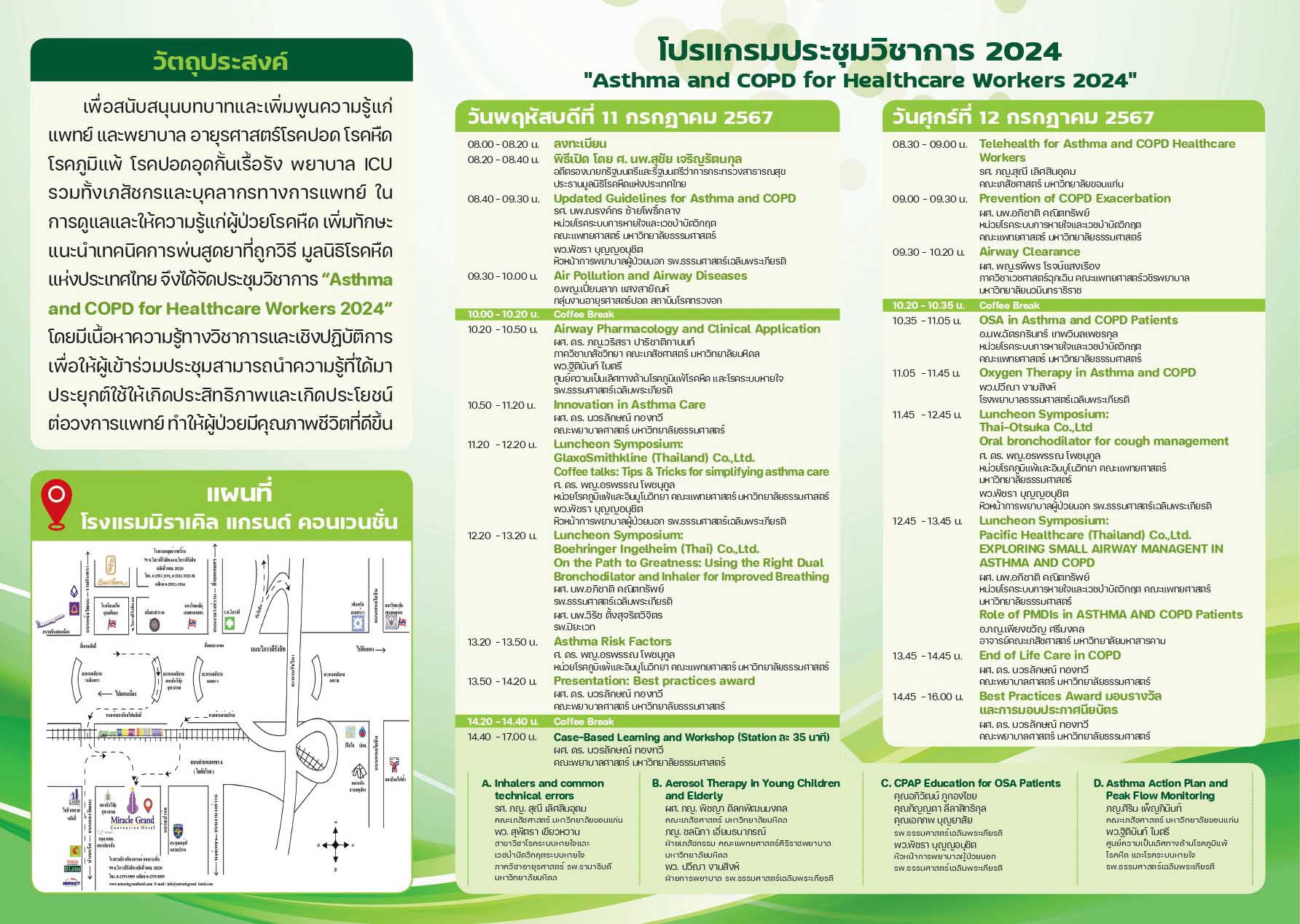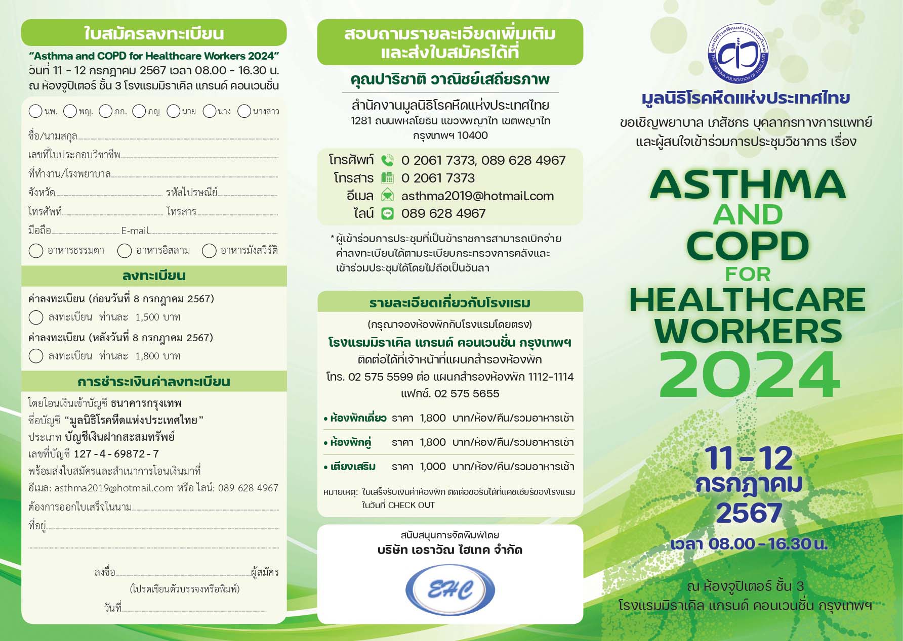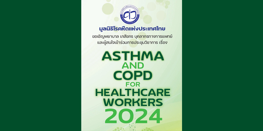 มูลนิธิโรคหืดแห่งประเทศไทย จัดการประชุมวิชาการ เรื่อง ASTHMA AND COPD FOR HEALTHCARE WORKERS 2024 ในวันที่ 11-12 กรกฎาคม 2567 ณ ห้องจูปิเตอร์ ชั้น 3 โรงแรมมิราเคิล แกรนด์ คอนเวนชั่น กรุงเทพฯ
