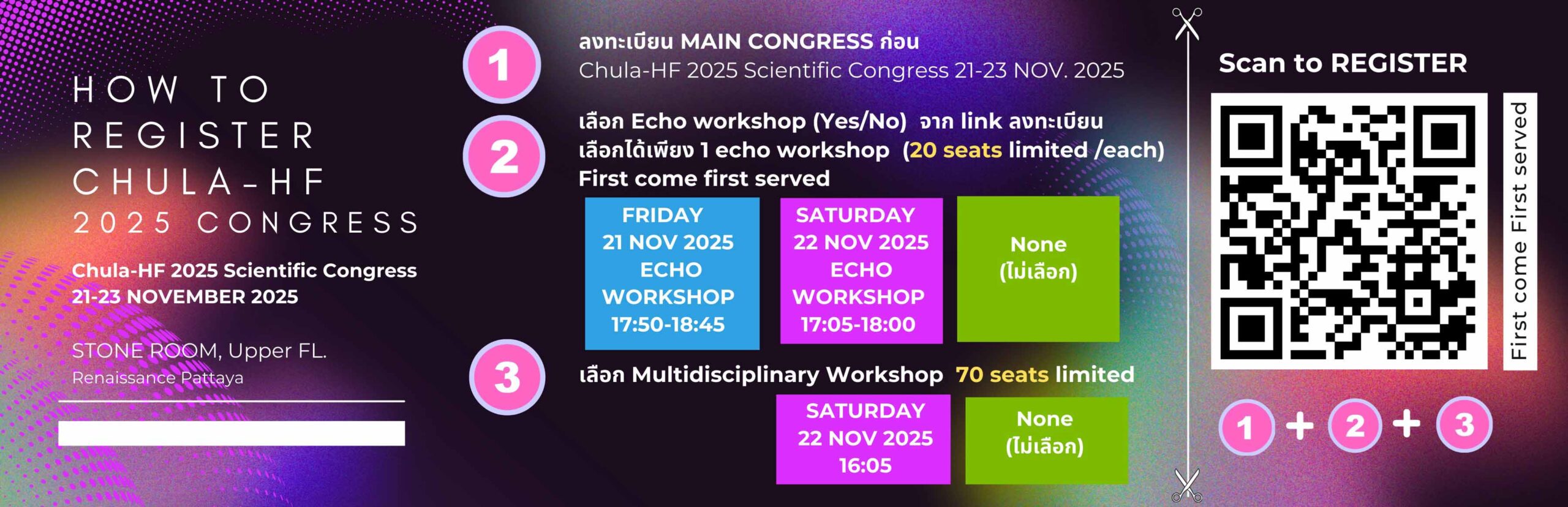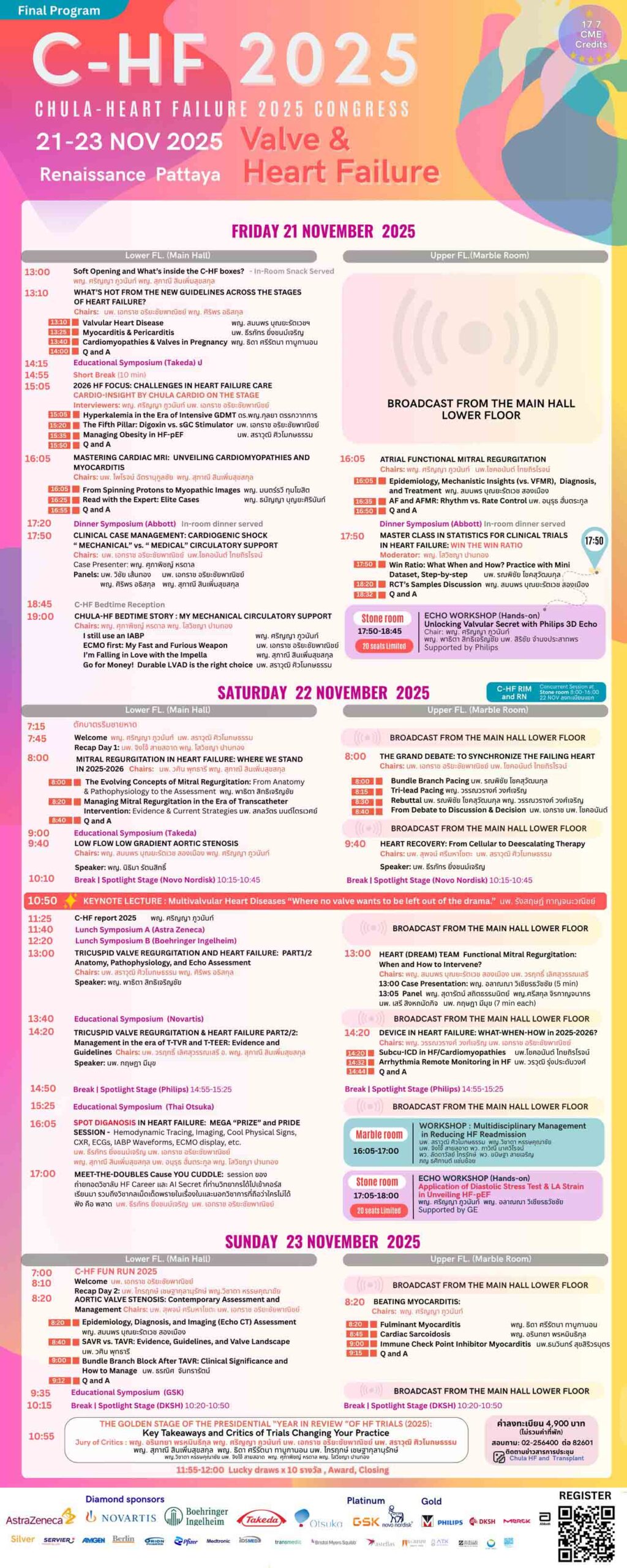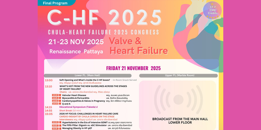 สาขาวิชาหัวใจและหลอดเลือด ภาควิชาอายุรศาสตร์ คณะแพทยศาสตร์ จุฬาลงกรณ์มหาวิทยาลัย จัดการประชุมวิชาการ C-HF 2025 Chulalongkorn-Heart Failure 2025 Scientific Congress วันที่ 21-23 พฤศจิกายน 2568 ณ โรงแรมเรเนซอง พัทยา จ.ชลบุรี