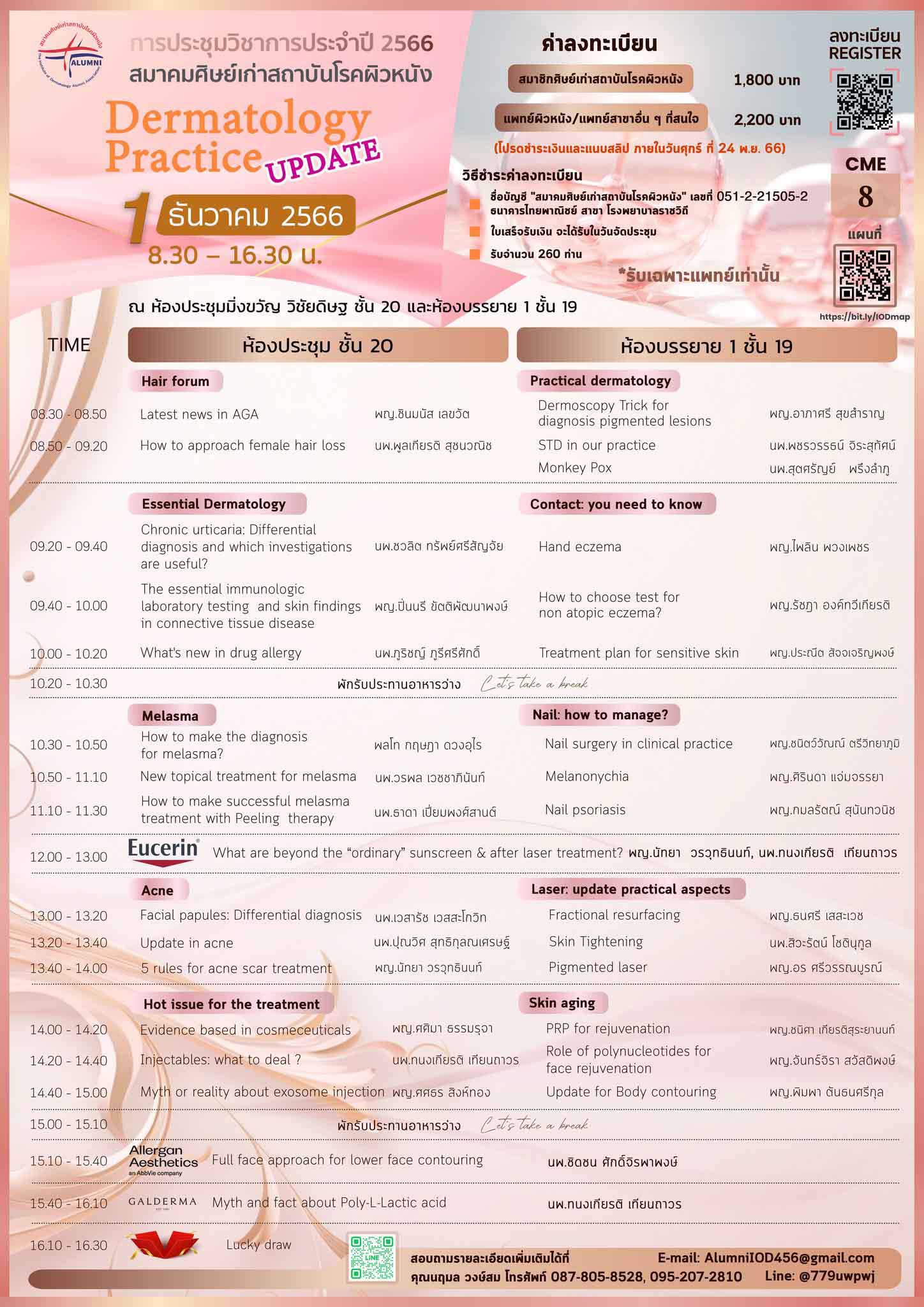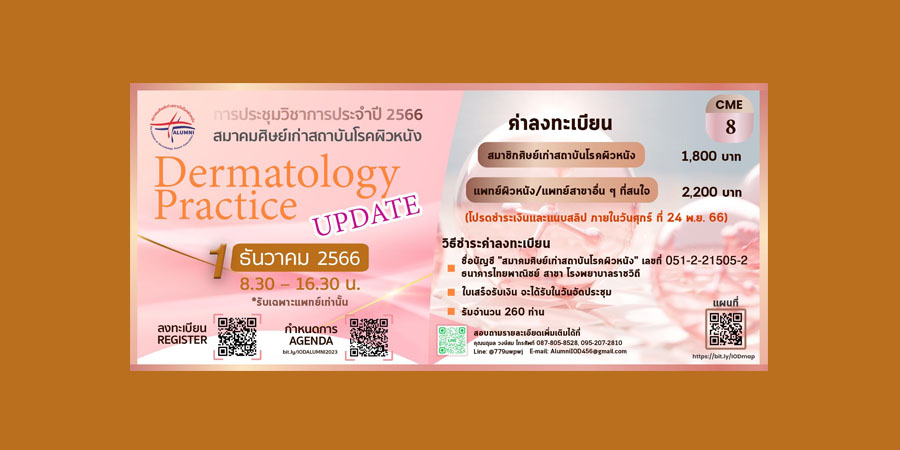 สมาคมศิษย์เก่าสถาบันโรคผิวหนัง จัดการประชุมวิชาการประจำปี 2566 Dermatology Practice Update วันที่ 1 ธันวาคม 2566 เวลา 08.30-16.30 น. ณ ห้องประชุมมิ่งขวัญ วิชัยดิษฐ ชั้น 20  และห้องบรรยาย 1 ชั้น 19 อาคาร สถาบันโรคผิวหนัง ถ.ราชวิถี กรุงเทพฯ