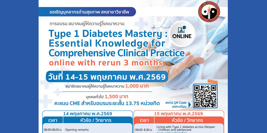 สมาคมผู้ให้ความรู้โรคเบาหวาน จัดการอบรมหลักสูตร “Type 1 Diabetes Mastery: Essential Knowledge for Comprehensive Clinical Practice” ในวันที่ 14–15 พฤษภาคม 2569 รูปแบบ Online พร้อมรับชมย้อนหลังได้ 3 เดือน