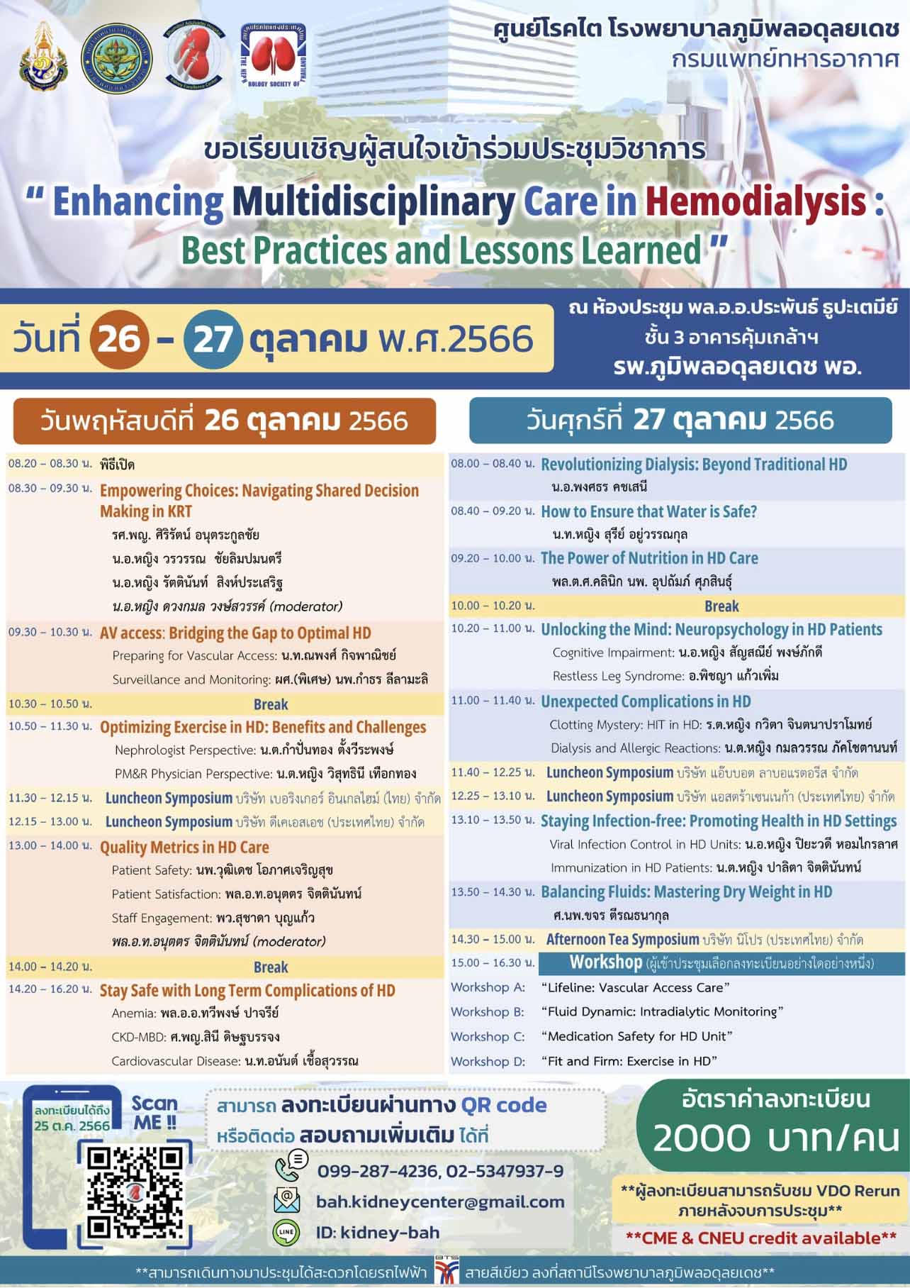 ศูนย์โรคไต โรงพยาบาลภูมิพลอดุลยเดช กรมแพทย์ทหารอากาศ จัดการประชุมวิชาการ “Enhancing Multidisciplinary Care in Hemodialysis: Best Practice & Lessons Learned” ระหว่างวันที่ 26 – 27 ตุลาคม 2566 รูปแบบ Onsite ณ ห้องประชุม พล.อ. อ.ประพันธ์ ธูปะเตมีย์ ชั้น 3 อาคารคุ้มเกล้าฯ & VDO (rerun) หลังจบการประชุม สำหรับผู้ลงทะเบียนเท่านั้น
