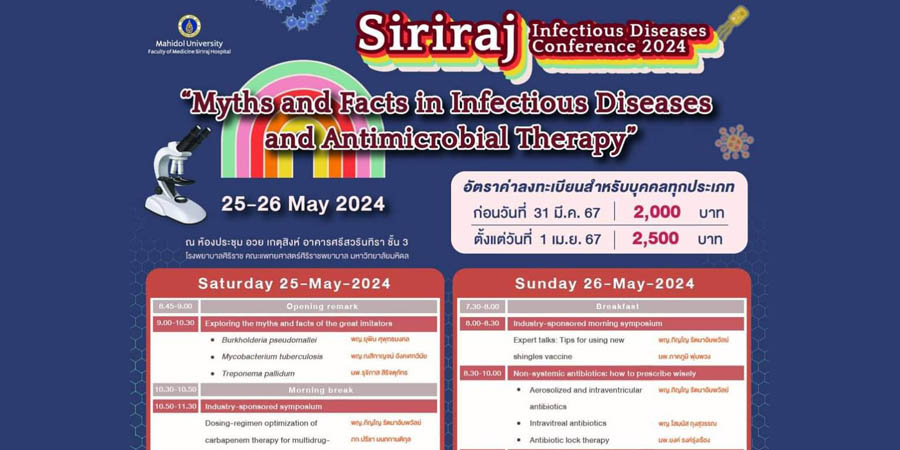 สาขาโรคติดเชื้อและอายุรศาสตร์เขตร้อน ภาควิชาอายุรศาสตร์ คณะแพทยศาสตร์ศิริราชพยาบาล จัดงานประชุมวิชาการประจำปี Siriraj Infectious Diseases Conference 2024 ในหัวข้อ Myths and Facts in Infectious Diseases and Antimicrobial Therapy ระหว่างวันที่ 25-26 พฤษภาคม 2567 รูปแบบ onsite ณ ห้องประชุม อวย เกตุสิงห์ อาคารศรีสวรินทิรา ชั้น 3 โรงพยาบาลศิริราช คณะแพทยศาสตร์ศิริราชพยาบาล มหาวิทยาลัยมหิดล และมี rerun 1 เดือน