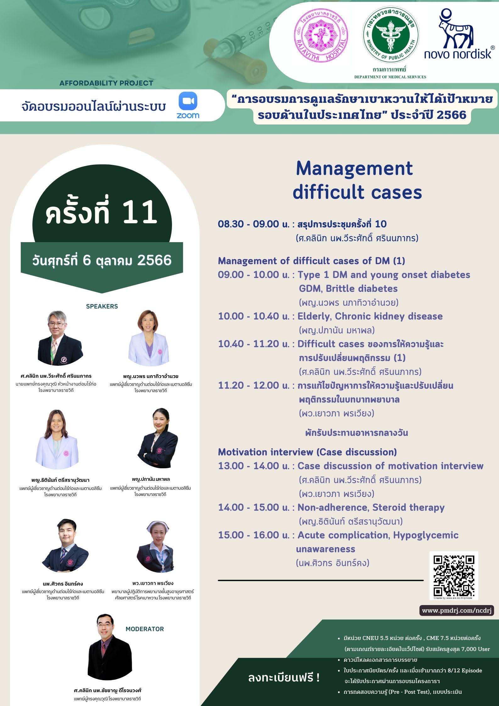 ศูนย์ความเป็นเลิศทางการแพทย์ ด้านโรคไม่ติดต่อเรื้อรัง โรงพยาบาลราชวิถี จัดโครงการ ”การอบรมการดูแลรักษาเบาหวานให้ได้เป้าหมายรอบด้านในประเทศไทย” ประจำปี 2566 ครั้งที่ 11 เรื่อง “ Management difficult cases ” ในวันศุกร์ที่ 6 ตุลาคม 2566 รูปแบบ online