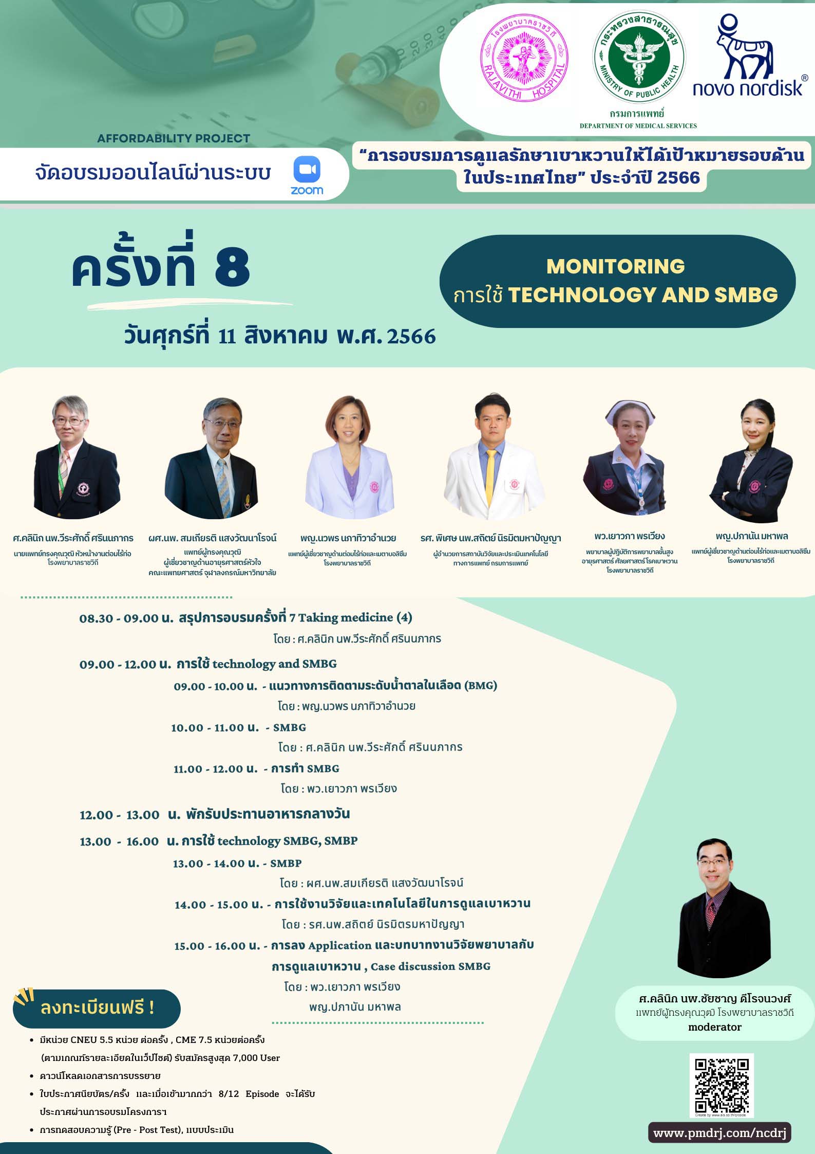 ศูนย์ความเป็นเลิศทางการแพทย์ ด้านโรคไม่ติดต่อเรื้อรัง โรงพยาบาลราชวิถี จัดโครงการ ”การอบรมการดูแลรักษาเบาหวานให้ได้เป้าหมายรอบด้านในประเทศไทย” ประจำปี 2566 ครั้งที่ 8 เรื่อง “Monitoring การใช้ Technology and SMBG” ในวันศุกร์ที่ 11 สิงหาคม 2566 รูปแบบ online