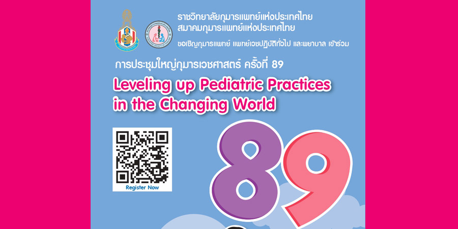 ราชวิทยาลัยกุมารแพทย์แห่งประเทศไทยและสมาคมกุมารแพทย์แห่งประเทศไทย จัดการประชุมใหญ่กุมารเวชศาสตร์ ครั้งที่ 89 “Leveling up Pediatric Practices in the Changing World” วันที่ 25-27 เมษายน 2567 ณ ศูนย์ประชุมพีช โรงแรมรอยัล คลิฟ บีช พัทยา จังหวัดชลบุรี