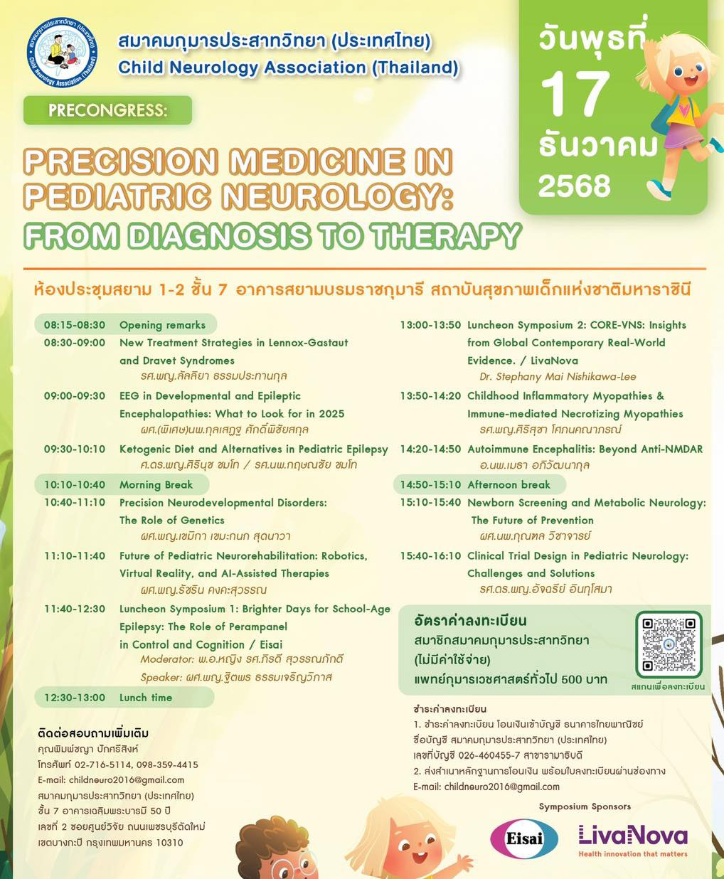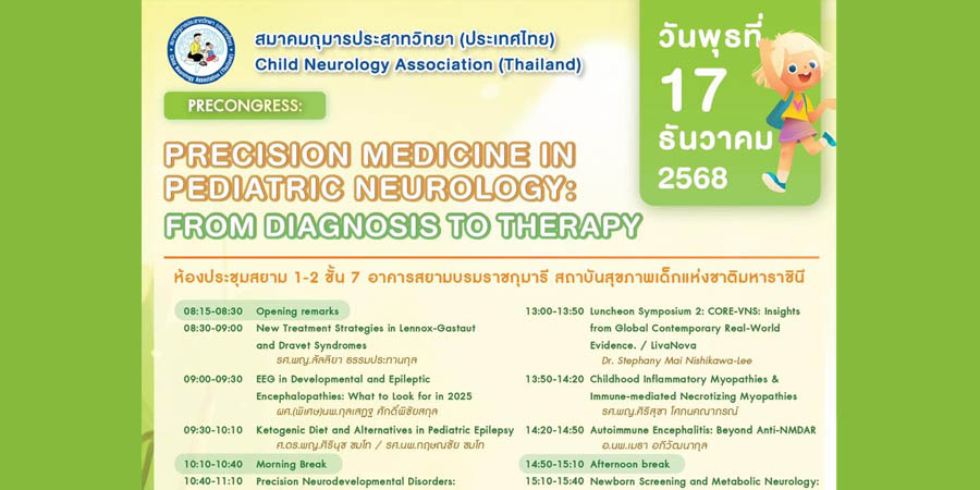 สมาคมกุมารประสาทวิทยา (ประเทศไทย) จัดการประชุมวิชาการ Precongress : Precision Medicine in Pediatric Neurology : from Diagnosis to Therapy ในวันที่ 17 ธันวาคม 2568 ณ ห้องประชุมสยาม 1-2 ชั้น 7 อาคารสยามบรมราชกุมารี สถาบันสุขภาพเด็กแห่งชาติมหาราชินี