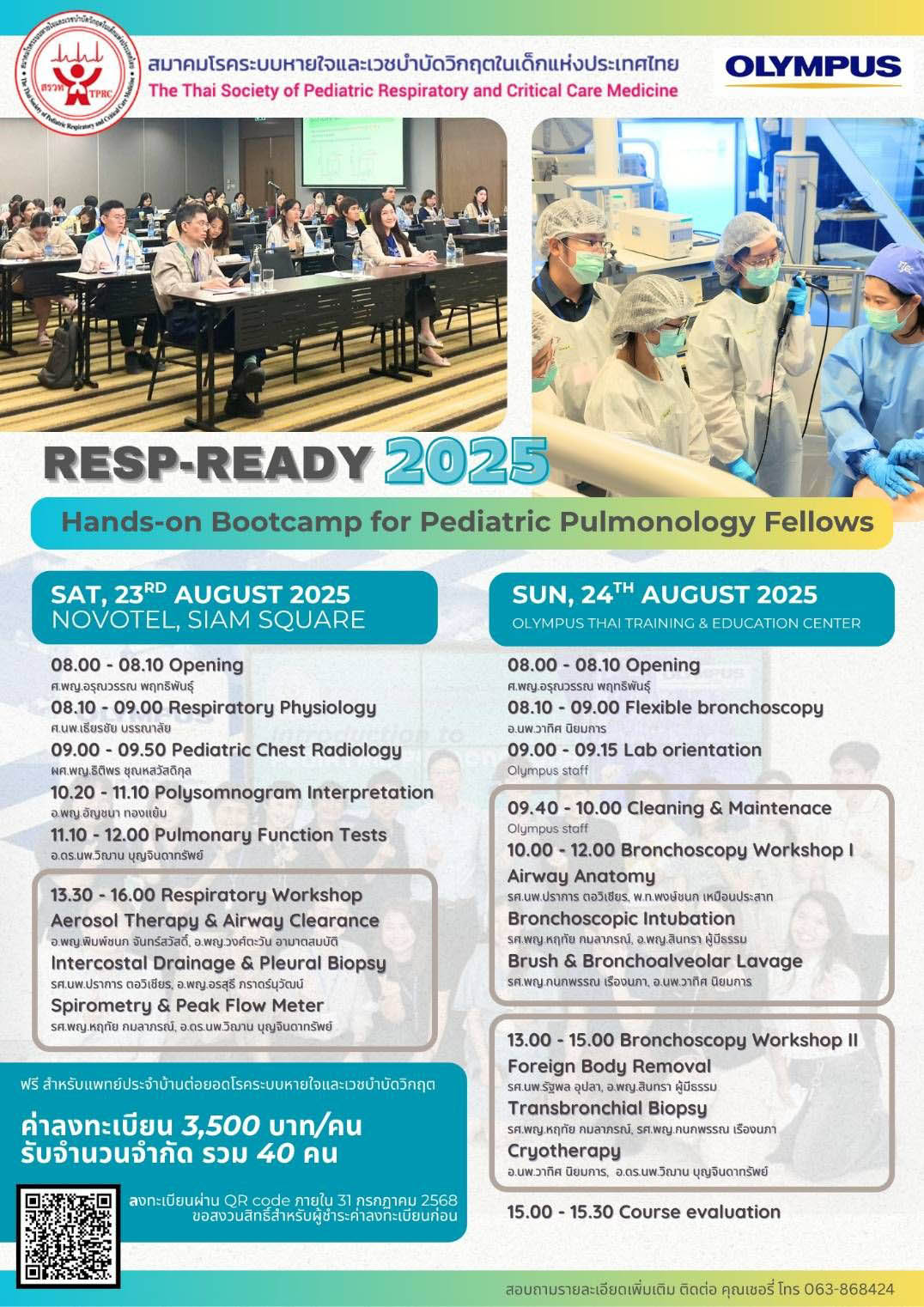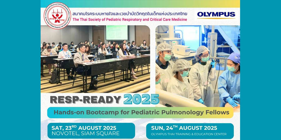 สมาคมโรคระบบหายใจและเวชบำบัดวิกฤตในเด็กแห่งประเทศไทย จัดการประชุมวิชาการ RESP-READY 2025: Hands-on Bootcamp for Pediatric Pulmonology  ในวันที่ 23 สิงหาคม 2568 ณ โรงแรม Novotel Siam Square และ  Olympus Thai Training & Education Center กรุงเทพฯ ในวันที่ 24 สิงหาคม 2568