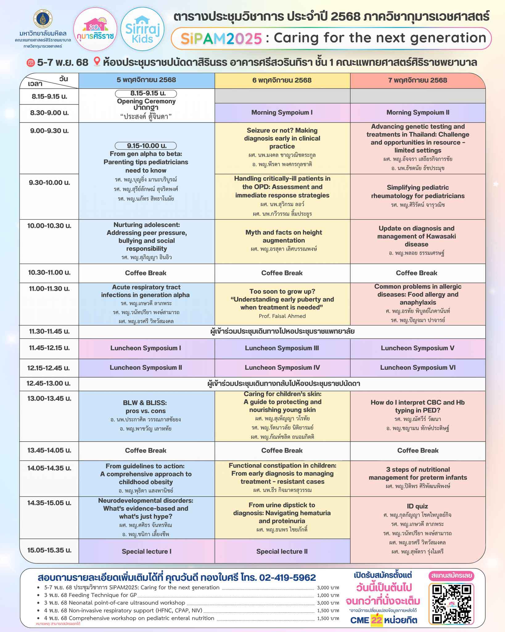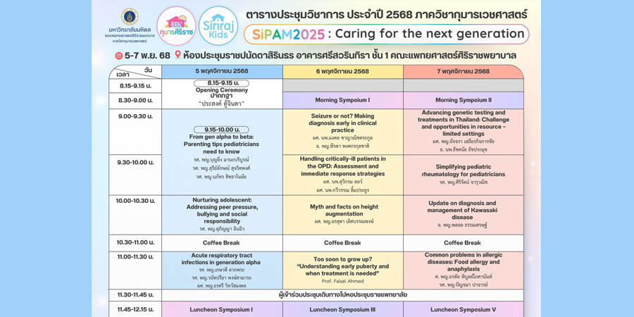 ภาควิชากุมารเวชศาสตร์ คณะแพทยศาสตร์ศิริราชพยาบาล จัดงานประชุมวิชาการ ประจำปี 2568 Siriraj Pediatric Annual Meeting (SiPAM2025) : Caring for the next generation ในวันที่ 5-7 พฤศจิกายน 2568 ณ ห้องประชุมราชปนัดดาสิรินธร อาคารศรีสวรินทิรา ชั้น 1 คณะแพทยศาสตร์ศิริราชพยาบาล