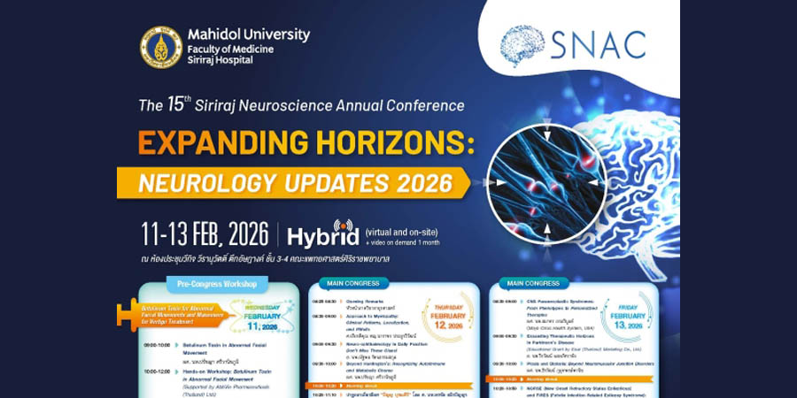 สาขาวิชาประสาทวิทยา ภาควิชาอายุรศาสตร์ คณะแพทยศาสตร์ศิริราชพยาบาล จัดการประชุมวิชาการ The 15th Siriraj Neuroscience Annual Conference (SNAC) ภายใต้ธีม “Expanding Horizons: Neurology Updates 2026” วันที่ 11–13 กุมภาพันธ์ 2569 รูปแบบ Hybrid ณ ห้องประชุมวีกิจ วีรานุวัตติ์ ตึกอัษฎางค์ ชั้น 3-4 คณะแพทยศาสตร์ศิริราชพยาบาล