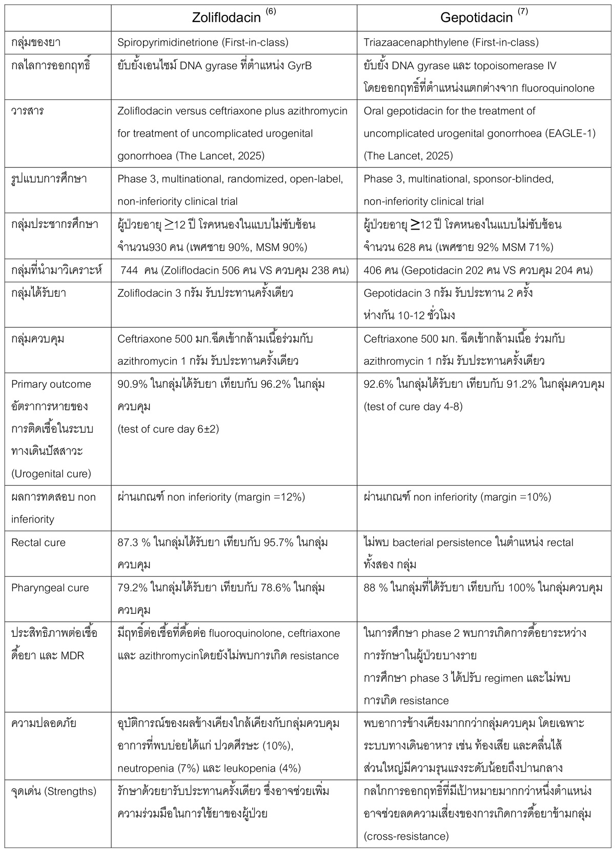 ตารางที่ 1 การเปรียบเทียบยา Zoliflodacin และ Gepotidacin สำหรับการรักษาการติดเชื้อ Neisseria gonorrhea