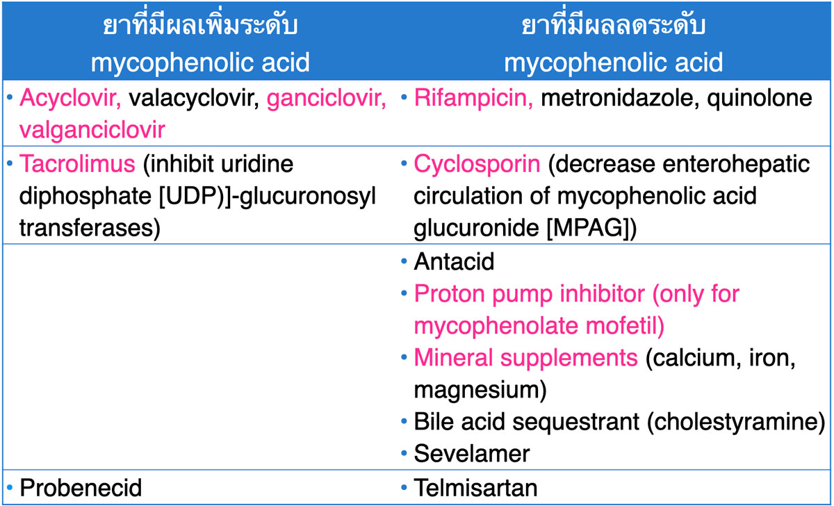 ยากลุ่ม mycophenolateได้แก่ mycophenolate mofetil (MMF) และ enteric-coated mycophenolate sodium (EC-MPS) ยาทั้งสองตัว เมื่อเข้าสู่ร่างกายจะแตกตัวเป็น mycophenolic acid ออกฤทธิ์ยับยั้งเอนไซม์ inosine monophosphate dehydrogenase ซึ่งเป็นเอนไซม์สำคัญของกระบวนการ de novo purine synthesis และมีความจำเป็นสำหรับการแบ่งตัวของลิมโฟไซต์ (lymphocyte) ยากลุ่ม mycophenolic acid จึงออกฤทธิ์ยับยั้งลิมโฟไซต์โดยตรง [2] อันตรกิริยาระหว่างยาที่สำคัญของ mycophenolate กับยาอื่น คือยากลุ่ม calcineurin inhibitor โดย tacrolimus มีผลเพิ่มระดับ mycophenolic acid ในขณะที่ cyclosporin มีผลลดระดับ mycophenolic acid ดังนั้นเมื่อใช้ยากลุ่ม mycophenolate ร่วมกับ tacrolimus จึงใช้ขนาดยา mycophenolate ต่ำว่าเมื่อเทียบกับการใช้ร่วมกับ cyclosporin (รูปที่ 1) อันตรกิริยาระหว่างยาที่อาจทำให้เกิดผลข้างเคียงที่สำคัญของ mycophenolate อีกประการคือกับ acyclovir, ganciclovir, หรือ valganciclovir ซึ่งยาเหล่านี้ส่งผลทำให้ระดับ mycophenolic acid เพิ่มขึ้น จึงเพิ่มความเสี่ยงต่อการเกิดภาวะเม็ดเลือดขาวในเลือดต่ำ ดังนั้นเมื่อใช้ยาสองกลุ่มนี้ร่วมกัน จะต้องติดตามปริมาณเม็ดเลือดขาวในเลือดเป็นระยะ ปรับขนาดยา acyclovir, ganciclovir, หรือ valganciclovir ให้เหมาะสมตามการทำงานของไต และอาจพิจารณาลดขนาดยา mycophenolate ลงหากเกิดภาวะเม็ดเลือดขาวในเลือดต่ำ