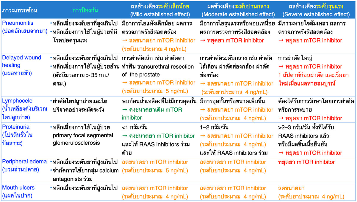 ผลข้างเคียงที่สำคัญของ mTOR inhibitor ได้แก่ ไขมันในเลือดสูง แผลหายช้า แผลในปาก ปอดอักเสบจากยา บวมส่วนปลาย (peripheral edema) และโปรตีนรั่วในปัสสาวะ ผลข้างเคียงเหล่านี้สัมพันธ์กับระดับยาในเลือด โดยเฉพาะการเกิดแผลในปากและการบวมส่วนปลาย แนวทางการปรับลดยาจึงขึ้นกับความรุนแรงของ ผลข้างเคียงที่เกิดขึ้น (รูปที่ 2) ผู้ป่วยที่จะเริ่มใช้ mTOR inhibitor ควรมีโปรตีนในปัสสาวะน้อยกว่า 0.5 – 0.8 กรัมต่อวัน และต้องเริ่มระวังหากผู้ป่วยที่ได้รับ mTOR inhibitor อยู่และมีโปรตีนในปัสสาวะมากกว่า 0.8 – 1.0 กรัมต่อวัน เนื่องจาก mTOR inhibitor มีผลต่อ podocyte จึงทำให้เกิดโปรตีนรั่วในปัสสาวะได้ แนวทางการจัดการผู้ป่วยที่ได้รับ mTOR inhibitor และมีโปรตีนรั่วในปัสสาวะอาจเริ่มด้วยการลดขนาดยาเพื่อทำให้ระดับยาในเลือดลดลงแล้วดูการตอบสนอง แต่ถ้าสงสัยว่าโปรตีนที่รั่วในปัสสาวะนั้นจะเกิดจากสาเหตุอื่น เช่น chronic antibody-medicated rejection ควรต้องทำการเจาะชิ้นเนื้อไตเพื่อพิสูจน์ ผลข้างเคียงที่สำคัญอีกประการของ mTOR inhibitor คือแผลหายช้า ดังนั้นในผู้ป่วยที่ได้รับ mTOR inhibitor และต้องได้รับการผ่าตัดใหญ่ ควรต้องหยุด mTOR inhibitor ก่อนอย่างน้อย 1 สัปดาห์ โดยให้ยากลุ่ม mycophenolate ทดแทนในช่วงที่หยุด mTOR inhibitor และกลับมาให้ mTOR inhibitor หลังจากผ่าตัดแล้ว 5 – 7 วันหากไม่มีภาวะแทรกซ้อนของแผลผ่าตัด
