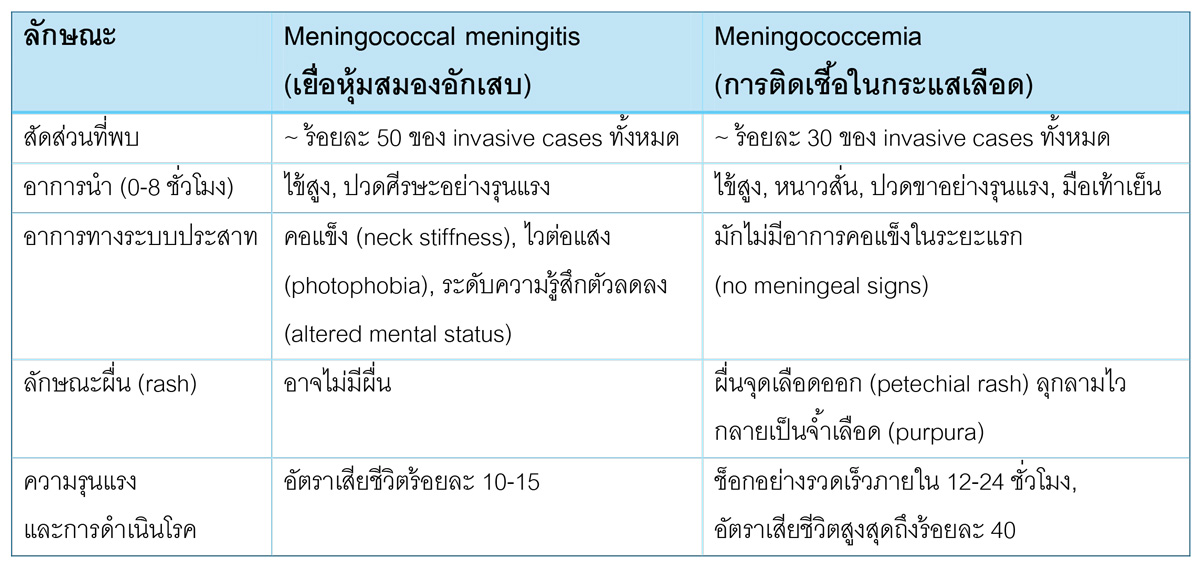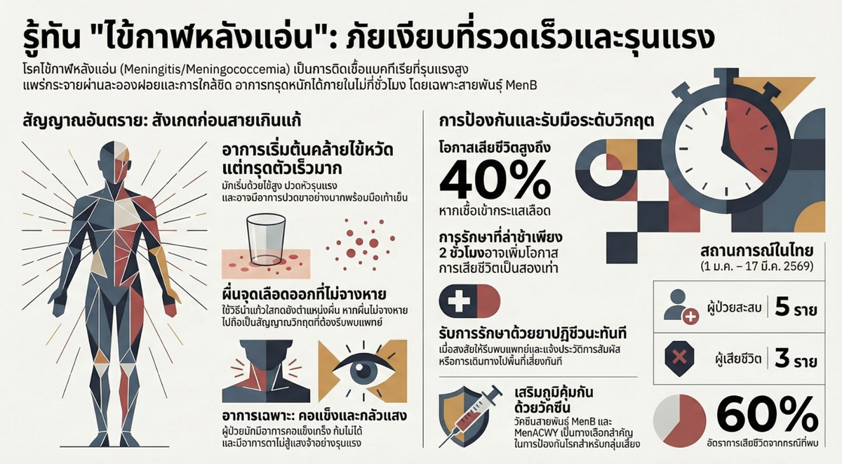 โรคติดเชื้อไข้กาฬหลังแอ่น (Invasive Meningococcal Disease) เกิดจากเชื้อแบคทีเรีย Neisseria meningitidis จัดเป็นภาวะฉุกเฉินทางการแพทย์ที่มีความสำคัญอย่างยิ่งและอาจเป็นอันตรายถึงชีวิตได้ แม้ว่าอุบัติการณ์ของโรคในภาพรวมจะพบได้ไม่บ่อย แต่มีความรุนแรงและมีการดำเนินโรคที่รวดเร็วมาก และมีอัตราการเสียชีวิต (case fatality rate) สูงถึงร้อยละ 10 – 15 แม้จะได้รับการรักษาอย่างทันท่วงที และอัตราการเสียชีวิตอาจพุ่งสูงถึงร้อยละ 40 ในกลุ่มผู้ป่วยที่มีภาวะติดเชื้อในกระแสเลือด (Meningococcemia) โรคนี้สามารถทำให้ผู้ป่วยทรุดหนักและเสียชีวิตได้ภายใน 12 – 24 ชั่วโมงนับจากเริ่มมีอาการ (รูปที่ 1) ทั้งนี้มีรายงานการระบาดแบบกลุ่มก้อน (cluster outbreak) ล่าสุดในกลุ่มนักศึกษาที่ประเทศอังกฤษในช่วงเดือนมีนาคม พ.ศ. 2569 (ค.ศ. 2026) นั้นเป็นเครื่องเตือนใจที่สำคัญให้แพทย์อายุรแพทย์และแพทย์เวชปฏิบัติทั่วไป ต้องตระหนักถึงความสำคัญของการวินิจฉัยและการรักษาที่รวดเร็ว เพื่อลดอัตราการเสียชีวิตและความพิการที่จะเกิดขึ้นกับผู้ป่วย