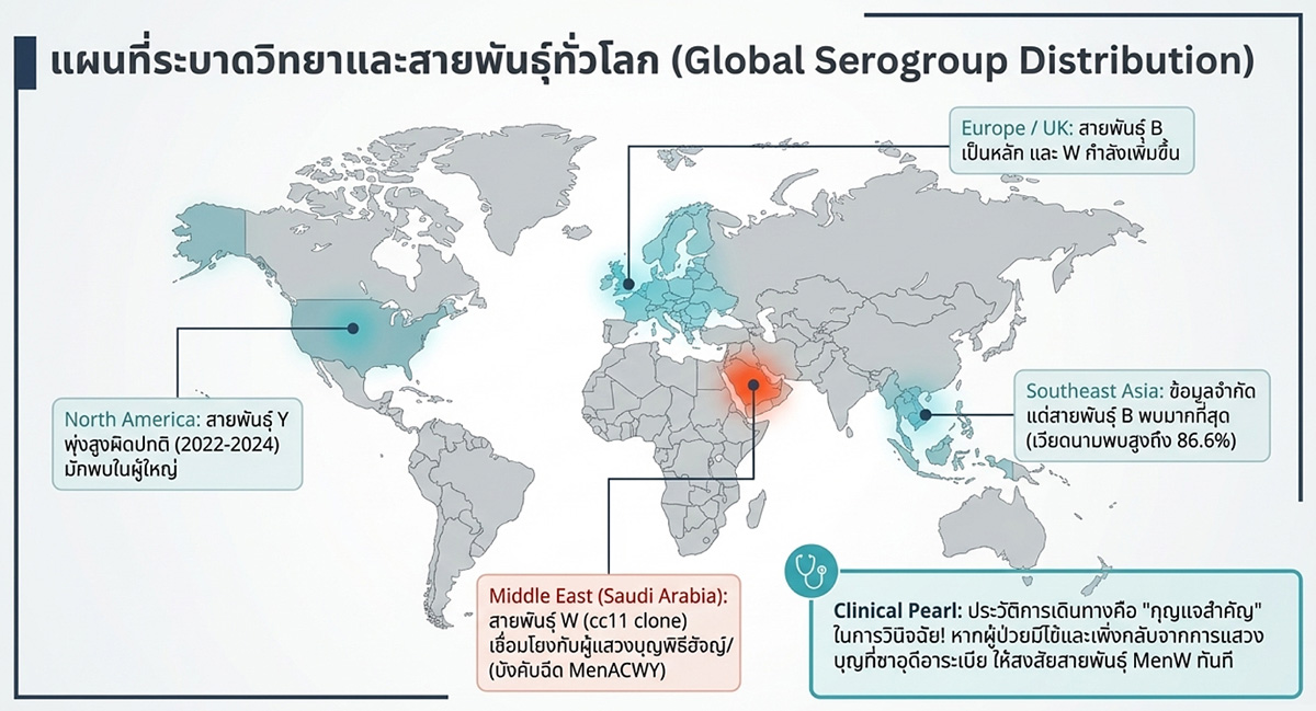 - Global epidemiology: อุบัติการณ์ของ IMD ทั่วโลกมักพบการกระจายแบบสองช่วงอายุ (bimodal age distribution) โดยพบอุบัติการณ์สูงสุดในเด็กทารกอายุต่ำกว่า 1 ปี และพบจุดสูงสุดรองลงมาในกลุ่มวัยรุ่นและวัยทำงานตอนต้นอายุ 15 – 25 ปี เชื้อสายพันธุ์ที่ก่อโรคส่วนใหญ่ทั่วโลก ได้แก่ serogroup A, B, C, W, X และ Y โดยสายพันธุ์ B (MenB) เป็นสาเหตุหลักของการติดเชื้อในยุโรปและอเมริกาเหนือ ในขณะที่สายพันธุ์ W (โดยเฉพาะ clonal complex 11) มีแนวโน้มเพิ่มขึ้นทั่วโลกจากการเชื่อมโยงกับการเดินทางแสวงบุญ (Hajj และ Umrah) (รูปที่ 2)