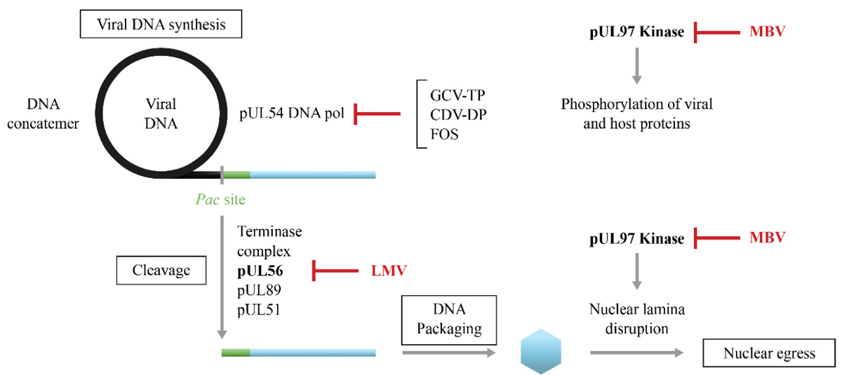 ยา letermovir เป็นยาต้านไวรัสชนิดใหม่ที่ออกฤทธิ์โดยการยับยั้ง CMV terminase complex โดยเฉพาะที่โปรตีน UL56 และ UL89 ส่งผลให้กระบวนการ cleavage และ packaging ของ viral DNA ถูกยับยั้ง ทำให้ไวรัสไม่สามารถสร้างอนุภาคที่สมบูรณ์ได้ จุดเด่นของ letermovir คือการออกฤทธิ์ในระยะท้ายของวงจรไวรัส (late stage inhibition) ซึ่งแตกต่างจากยาต้านไวรัสแบบดั้งเดิม เช่น ganciclovir ที่ออกฤทธิ์ยับยั้ง DNA polymerase ในระยะ DNA replication ดังนั้น letermovir จึงมีความจำเพาะต่อ CMV สูง และมีผลกระทบต่อเซลล์ของร่างกายน้อย โดยเฉพาะ ไม่กดการทำงานของไขกระดูก (รูปที่ 1)