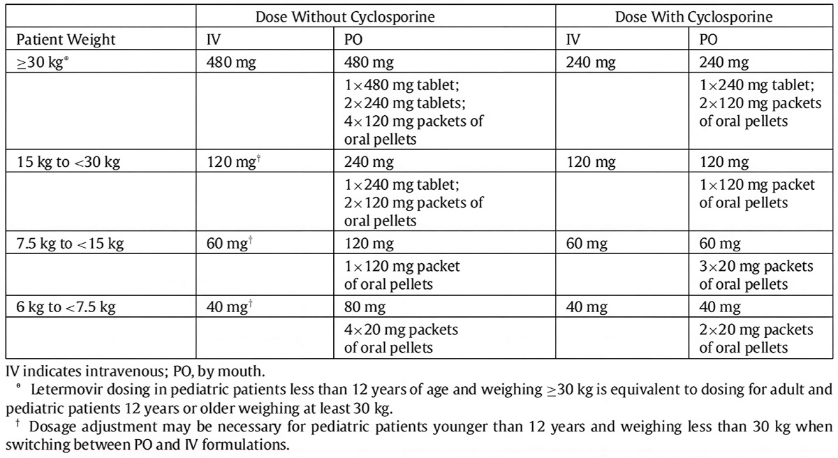 ปัจจุบันยา letermovir มี 2 ขนาด คือ oral pellet 20 และ 120 มิลลิกรัม ซึ่งช่วยเพิ่มความสะดวกในการใช้ยา โดยเฉพาะในผู้ป่วยที่ต้องการขนาดยาน้อยกว่า 120 มิลลิกรัม หรือผู้ที่ไม่สามารถกลืนยาเม็ดได้ โดยสามารถให้ยา oral pellet ทางปากร่วมกับอาหารอ่อน (soft food) ก่อนรับประทาน16 ขนาดยาของ letermovir ในผู้ป่วยเด็กแสดงไว้ในตารางที่ 1