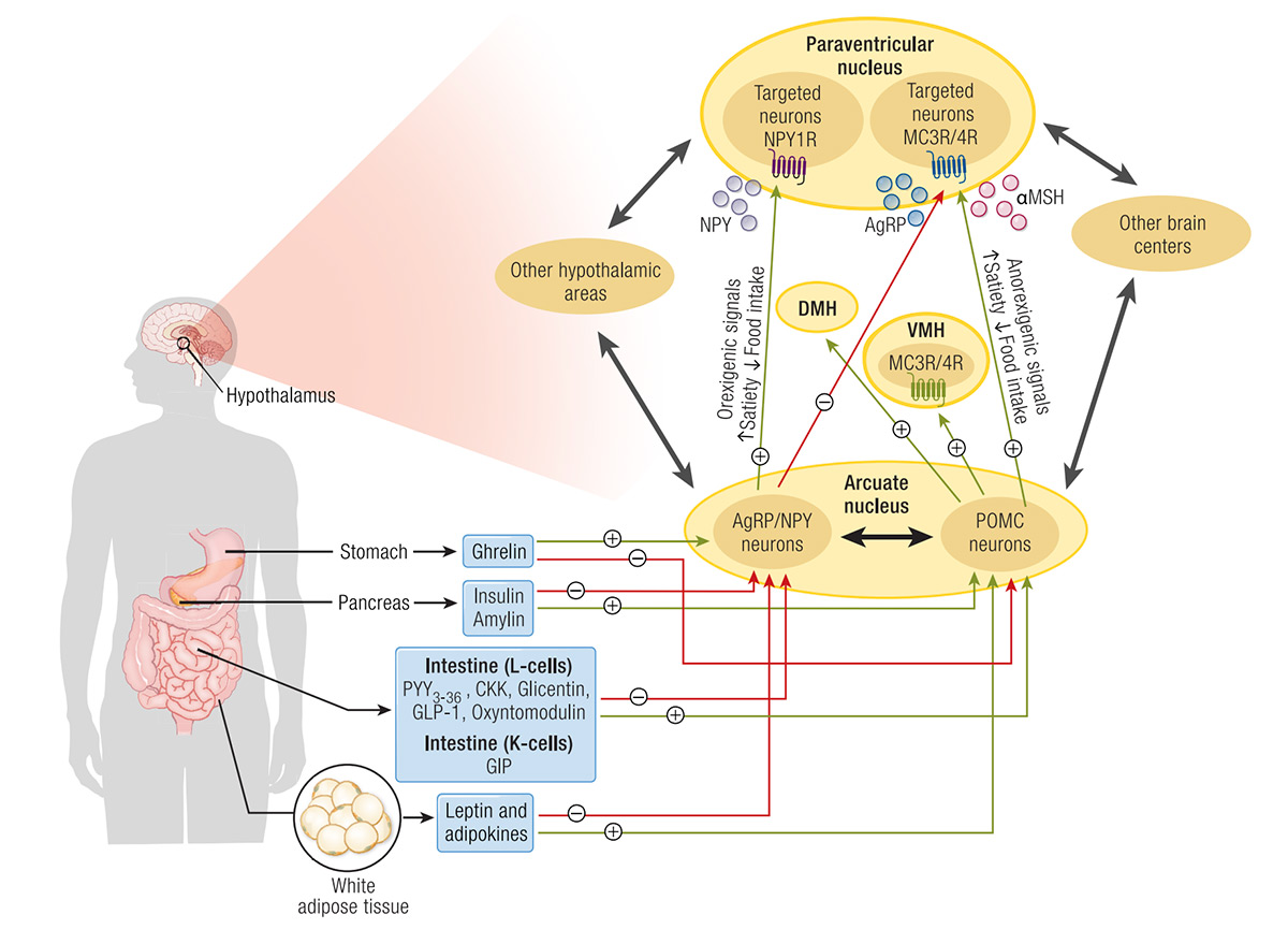 adipose tissue หลั่ง leptin ไปจับกับ leptin receptor (LEPR) ที่ hypothalamus การที่ leptin กระตุ้น LEPR ถูกส่งเสริมโดย Src homology 2B adaptor protein (SH2B1) ทำให้เกิดการสร้าง pro-opiomelanocortin (POMC) ถูกเปลี่ยนเป็น α-melanocyte-stimulating hormone (α-MSH) และ β-MSH โดย proprotein convertase 1 จากนั้น α-MSH จับกับ melanocortin-4 receptor (MC4R) มีผลให้เกิดความอิ่ม ลดการรับประทานอาหาร ปัจจัยอื่นที่มีผลต่อความอยากอาหาร เช่น ghrelin, peptide YY, cholecystokinin, GLP-1