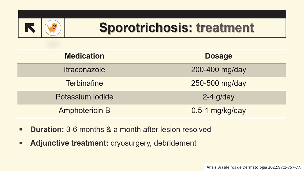 ยาหลักที่ใช้ คือ itraconazole ขนาดยาดังรูปที่ 3 เป็นระยะเวลาอย่างน้อย 3-6 เดือน โดยควรให้ยาจนกว่ารอยโรคหายสนิท และอาจให้ยาต่ออีกนาน 1 เดือน รายงานจากศิริราชพบว่ากว่าร้อยละ 42 รักษาหายที่ระยะเวลา 6 เดือน และร้อยละ 95 รักษาหายที่ระยะเวลา 12 เดือน โดยระยะเวลาเฉลี่ยที่รักษาหายอยู่ที่ 6 เดือน