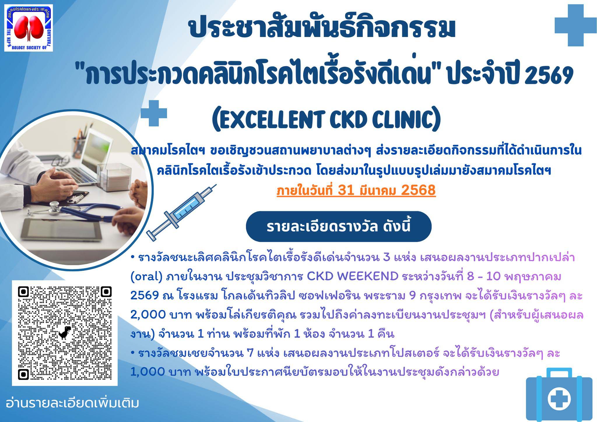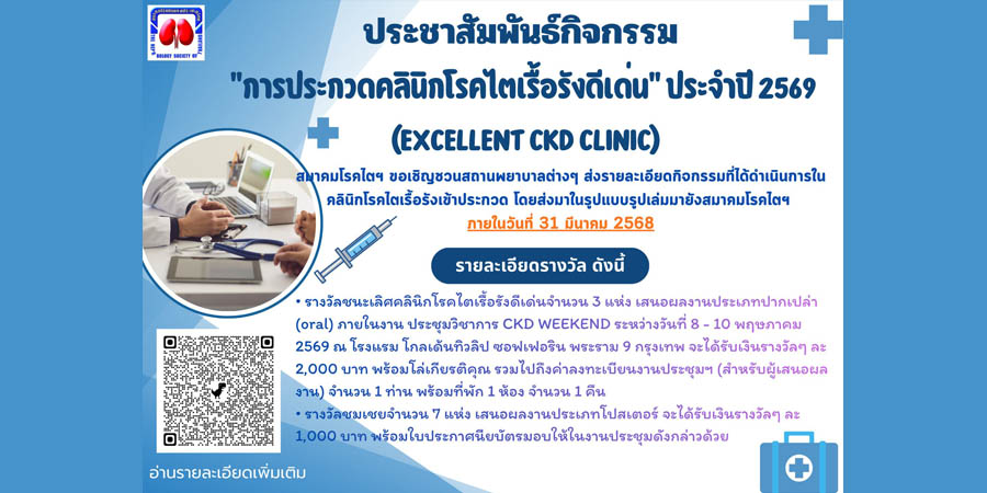 สมาคมโรคไตแห่งประเทศไทย จัดกิจกรรม “การประกวดคลินิกโรคไตเรื้อรังดีเด่น” ประจำปี 2569 (Excellent CKD clinic) เชิญชวนสถานพยาบาลต่าง ๆ ส่งรายละเอียดกิจกรรมที่ได้ดำเนินการในคลินิกโรคไตเรื้อรัง โดยส่งมาในรูปแบบรูปเล่ม ภายในวันที่ 31 มีนาคม 2568