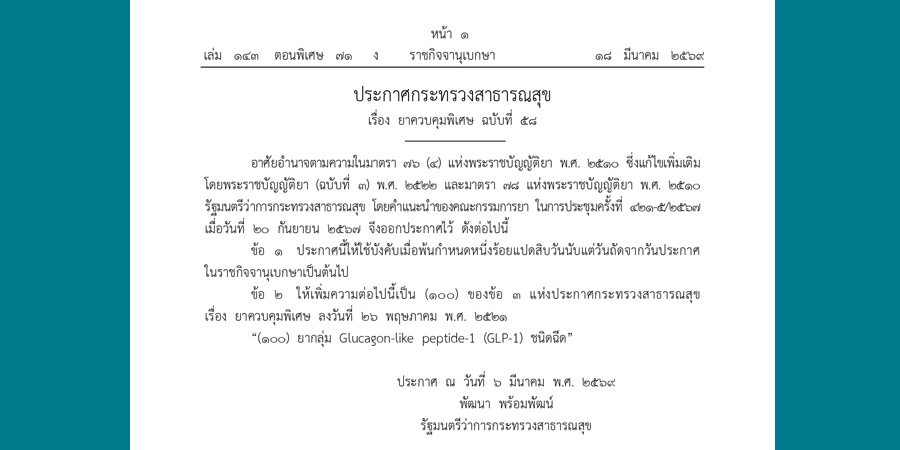 18 มีนาคม พ.ศ. 2569 ราชกิจจานุเบกษาเผยแพร่ประกาศ สธ. เรื่อง ยาควบคุมพิเศษ ฉบับที่ 58 ลงนามโดยนายพัฒนา พร้อมพัฒน์ รัฐมนตรีว่าการกระทรวงสาธารณสุข ลงวันที่ 6 มีนาคม พ.ศ. 2569 โดยอาศัยอำนาจตามพระราชบัญญัติยา พ.ศ. 2510 ซึ่งแก้ไขเพิ่มเติมโดยพระราชบัญญัติยา (ฉบับที่ 3) พ.ศ. 2522 และมาตรา 78 แห่งพระราชบัญญัติยา พ.ศ. 2510 กำหนดให้เพิ่ม ‘ยากลุ่ม Glucagon-like peptide-1 (GLP-1) ชนิดฉีด’ เป็นรายการยาควบคุมพิเศษลำดับที่ (100) และจะมีผลบังคับใช้หลังประกาศ 180 วัน