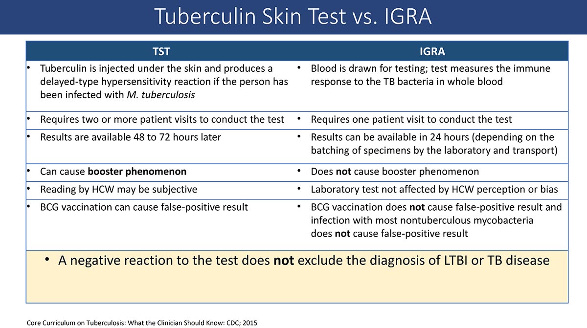 2. การทดสอบ interferon-gamma release assay (IGRA) ทำได้โดยการตรวจเลือดเพื่อช่วยในการวินิจฉัยการติดเชื้อ M. tuberculosis complex การทดสอบ IGRA เป็นวิธีการตรวจวัดปริมาณ interferon-gamma (IFN-γ) ที่ถูกสร้างภายหลังจากมีการติดเชื้อ M. tuberculosis complex ในร่างกาย ความไวและความจำเพาะจะเท่ากับหรือดีกว่าการทดสอบทุเบอร์คุลิน (5) ข้อเด่นของการตรวจ IGRAs จะช่วยลดผลการทดสอบที่เป็นผลบวกลวงจากการทดสอบทางผิวหนังด้วยทุเบอร์คุลิน ปัจจุบันมีวิธีการตรวจที่ได้รับการรับรองอยู่ 2 วิธี ได้แก่ QuantiFERON-TB Gold Plus (QFT-Plus) และ SPOT® TB test (T-spot) โดยที่รายละเอียดของการทดสอบ IGRA เทียบกับการทดสอบทางผิวหนังด้วยทุเบอร์คุลิน เป็นดังแสดง (slide 1)