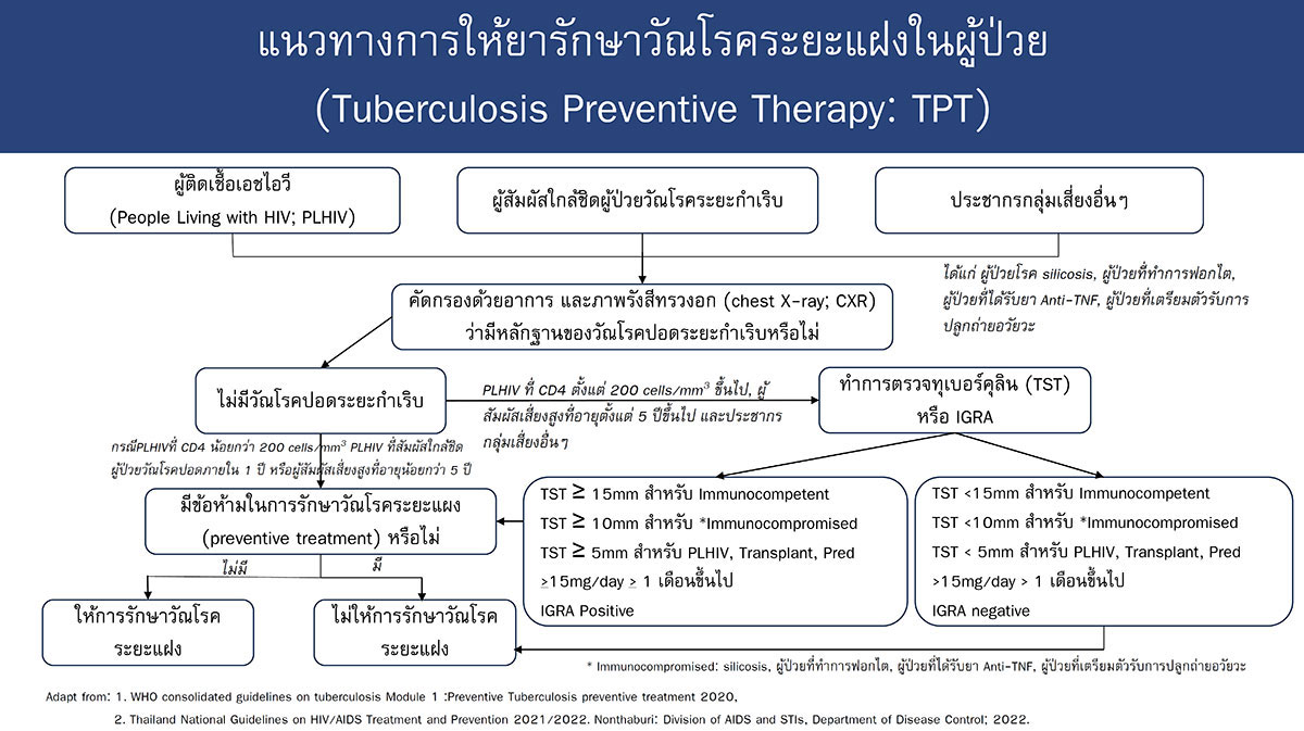 แนวทางการให้ยารักษาวัณโรคระยะแฝงในผู้ป่วย (Tuberculosis Preventive Therapy: TPT) นั้นเริ่มจากการคัดกรองที่มีความเสี่ยงสูงในการรับเชื้อวัณโรคและมีโอกาสสูงที่จะเกิดวัณโรคระยะกำเริบ (active tuberculosis) ได้แก่ ผู้ติดเชื้อเอชไอวี ผู้สัมผัสใกล้ชิดผู้ป่วยวัณโรคปอดระยะกำเริบ ประชากรกลุ่มเสี่ยงอื่นๆ ได้แก่ ได้แก่ ผู้ป่วยโรค silicosis, ผู้ป่วยที่ทำการฟอกไต, ผู้ป่วยที่ได้รับยา Anti-TNF, ผู้ป่วยที่เตรียมตัวรับการปลูกถ่ายอวัยวะ รวมไปถึงบุคลากรทางการแพทย์ การคัดกรองนั้นทำด้วยการคัดกรองอาการและภาพรังสีทรวงอกว่ามีหลักฐานของวัณโรคปอดระยะกำเริบหรือไม่ หากไม่มีหลักฐานของวัณโรคระยะกำเริบจะทำการตรวจทุเบอร์คุลินหรือ IGRA ต่อ (ภาพที่ 2) เมื่อผลเป็นบวกและไม่มีข้อห้ามในการรักษาวัณโรคระยะแฝงก็สามารถเริ่มการรักษาได้