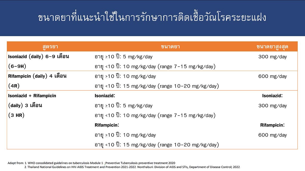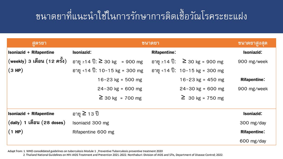 • rifapentine (P) สามารถให้ร่วมกับยาต้านไวรัสสูตร EFV หรือ DTG ร่วมกับยา กลุ่ม NRTI หลายสูตรได้ เช่น abacavir (ABC), lamivudine (3TC), tenofovir disoproxil fumarate (TDF) และ emtricitabine (FTC) แต่ไม่แนะนำให้ร่วมกับยากลุ่ม boosted PI, NNRTI บางชนิด (NVP, RPV) และ TAF (7,8)