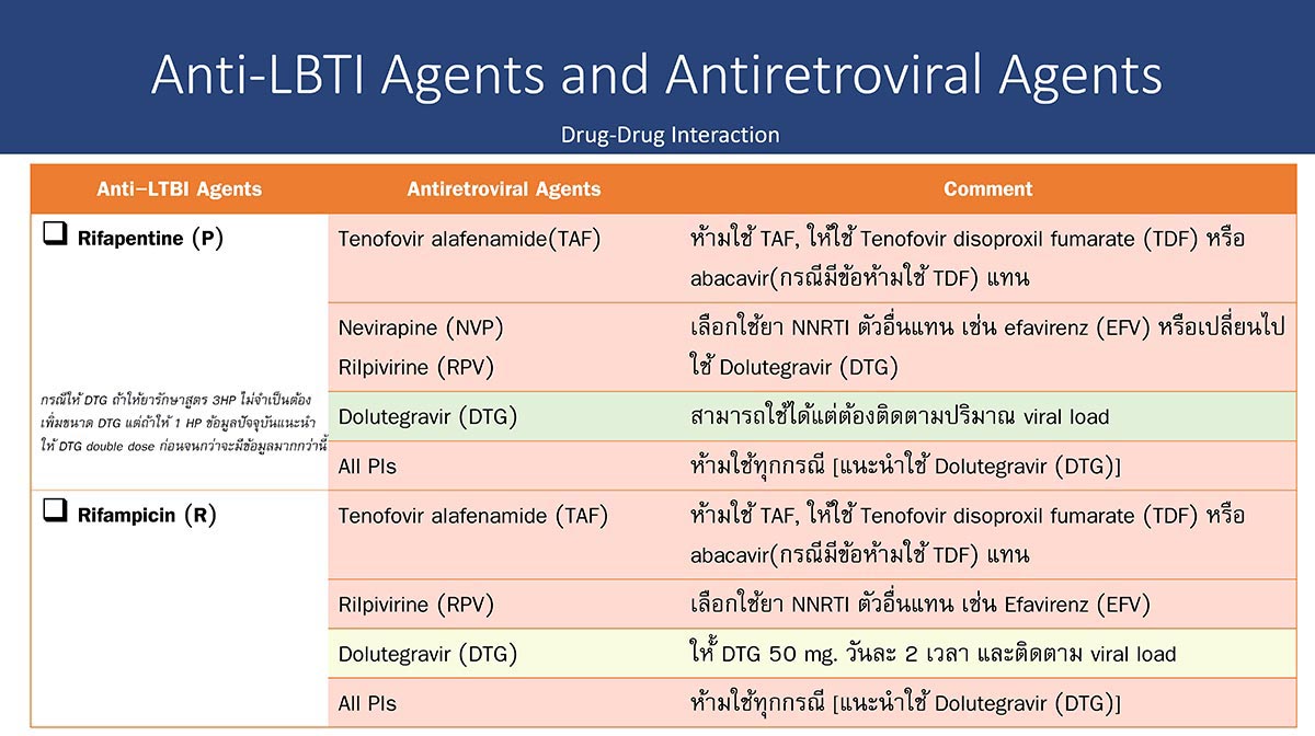 สิ่งสำคัญในการรักษาวัณโรคระยะแฝงในผู้ป่วยเอชไอวีนั้น ต้องคำนึงถึงปฏิกิริยาต่อยา (อันตรกิริยา หรือ drug -drug Interaction) โดยเฉพาะปฏิกิริยาระหว่างสูตรยารักษาวัณโรคระยะแฝง rifampicin และ rifapentine ซึ่งมีผลต่อยาต้านไวรัสเอชไอวีหลายชนิด (ภาพที่ 4)