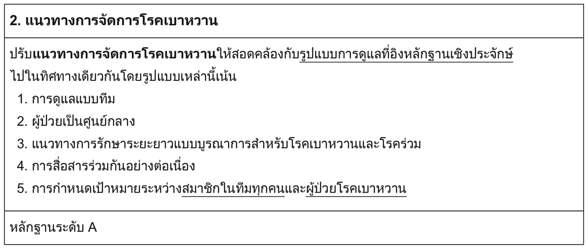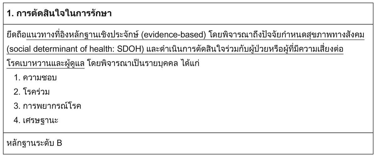 จากคำแนะนำที่ 1 สมาคมโรคเบาหวานแห่งสหรัฐอเมริกา (ADA) เน้นย้ำถึงความสำคัญของการดูแลที่เน้นผู้ป่วยเป็นศูนย์กลาง ซึ่งนิยามว่าเป็นการดูแลที่คำนึงถึงโรคร่วมและการพยากรณ์โรคของแต่ละบุคคล เคารพและตอบสนองต่อความชอบ ความต้องการ และค่านิยมของแต่ละบุคคล และมั่นใจว่าค่านิยมของแต่ละบุคคลจะเป็นแนวทางในการตัดสินใจทางคลินิกทั้งหมด