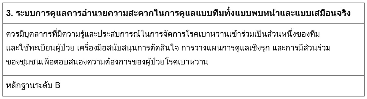 นอกจากนี้ ยังมีหลักฐานสนับสนุนประสิทธิผลของการให้บริการทางการแพทย์ทางไกลในการรักษาความดันโลหิตสูงและภาวะไขมันในเลือดผิดปกติ (18) กลยุทธ์เชิงปฏิสัมพันธ์ที่อำนวยความสะดวกในการสื่อสารระหว่างบุคลากรทางการแพทย์กับผู้ป่วยโรคเบาหวาน รวมถึงการใช้เว็บหรือข้อความสั้น และการปรับเปลี่ยนยา แนวโน้มว่าจะมีผลการรักษาที่ดีขึ้น (19) การใช้แพทย์ทางไกลอย่างเหมาะสมเพื่อปรับปรุงการจัดการโรคเบาหวานจำเป็นต้องคาดการณ์และแก้ไขอุปสรรคที่เกิดจากค่าใช้จ่าย ความสามารถ และทรัพยากร (รวมถึงการเข้าถึงอินเตอร์เน็ตความเร็วสูง) ของผู้ป่วยโรคเบาหวาน ขณะที่กระบวนการดูแลโรคเบาหวานและการเข้าถึงเทคโนโลยีหลายด้านได้พัฒนาขึ้นในระดับประเทศในทศวรรษที่ผ่านมา คุณภาพโดยรวมของการดูแลสำหรับผู้ป่วยเบาหวานยังคงไม่เป็นไปตามมาตรฐานที่ควรเป็น (20) ความพยายามในการยกระดับคุณภาพการดูแลผู้ป่วยเบาหวานรวมถึงการให้การดูแลที่สอดคล้องกับแนวทางที่มีหลักฐานรองรับ (21), ขยายบทบาทของทีมในการดำเนินกลยุทธ์การจัดการโรคที่เข้มข้นมากขึ้น (22), ติดตามพฤติกรรมการใช้ยา (23), ออกแบบกระบวนการดูแลใหม่ (24), นำเครื่องมือสุขภาพประชากรในระบบบันทึกสุขภาพอิเล็กทรอนิกส์ (EHR) มาใช้ (25), ส่งเสริมและให้ความรู้แก่ผู้ป่วยเบาหวาน (26), ลดอุปสรรคทางการเงิน (27), ใช้เทเลเฮลธ์เพื่อเพิ่มการเข้าถึงการดูแล, ประเมินและแก้ไขปัญหาทางจิตสังคม (28, 29) และการมีส่วนร่วมกับทรัพยากรชุมชนและนโยบายสาธารณะที่สนับสนุนรูปแบบการใช้ชีวิตที่มีสุขภาพดี (30)