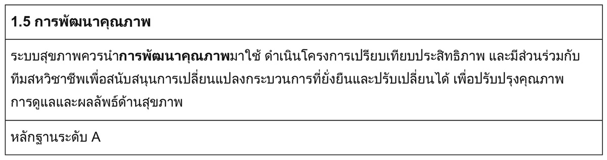 - ระบบสุขภาพ (เพื่อสร้างวัฒนธรรมที่มุ่งเน้นคุณภาพ)