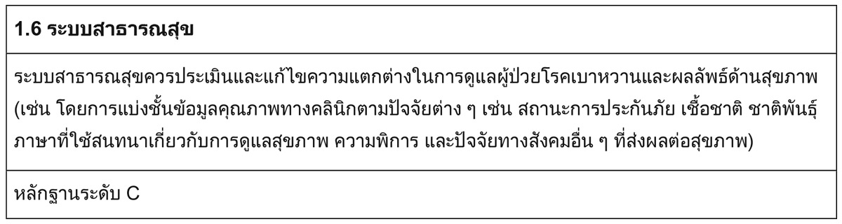 การทบทวนอย่างเป็นระบบล่าสุดสรุปว่า การพัฒนาคุณภาพ (Quality Improvement: QI) สามารถปรับปรุงผลลัพธ์อย่างมีนัยสำคัญสำหรับผู้ป่วยโรคเบาหวาน (31) ซึ่งปัจจุบันหลายโรงพยาบาลได้ผ่านการรับรอง มาตรฐาน Program and Disease Specific certification: PDSC) หรือมาตรฐานเฉพาะโรค/เฉพาะระบบ เป็นมาตรฐานที่พัฒนาขึ้นเพื่อสร้างการเรียนรู้และกระตุ้นการพัฒนาคุณภาพในสถานพยาบาลที่มีความเชี่ยวชาญเฉพาะโรคหรือระบบ โดยมีการพัฒนามาตรฐานเฉพาะโรค/เฉพาะระบบ (The Program and Disease Specific Standard: PDSS) เพื่อให้สถานพยาบาลสามารถพัฒนาคุณภาพการดูแลผู้ป่วยในกลุ่มโรคหรือระบบเฉพาะได้อย่างมีประสิทธิภาพ นอกจากนี้ยังมีการประเมินการรับรองคุณภาพของสถานพยาบาลตามมาตรฐานเหล่านี้ เพื่อให้สถานพยาบาลสามารถขอรับรองขั้นก้าวหน้า (Advanced HA) สำหรับการรับรอง HA PDSC โรค/ระบบเบาหวาน จาก สรพ. ได้แบ่งเป็น 3 ระดับ ได้แก่