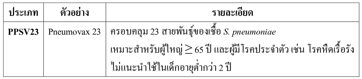 - วัคซีนชนิดโพลีแซคคาไรด์ (Pneumococcal Polysaccharide Vaccine: PPSV)