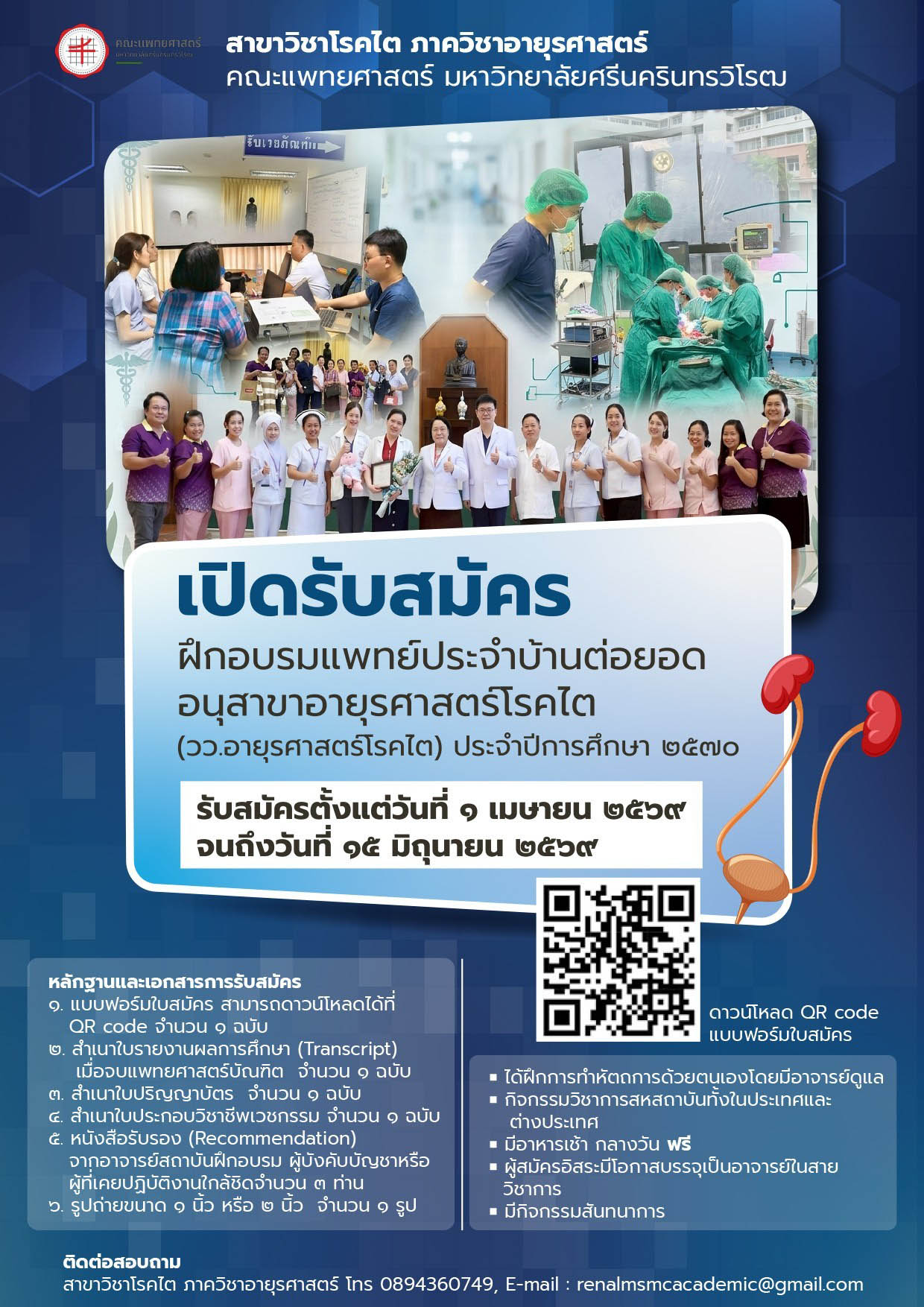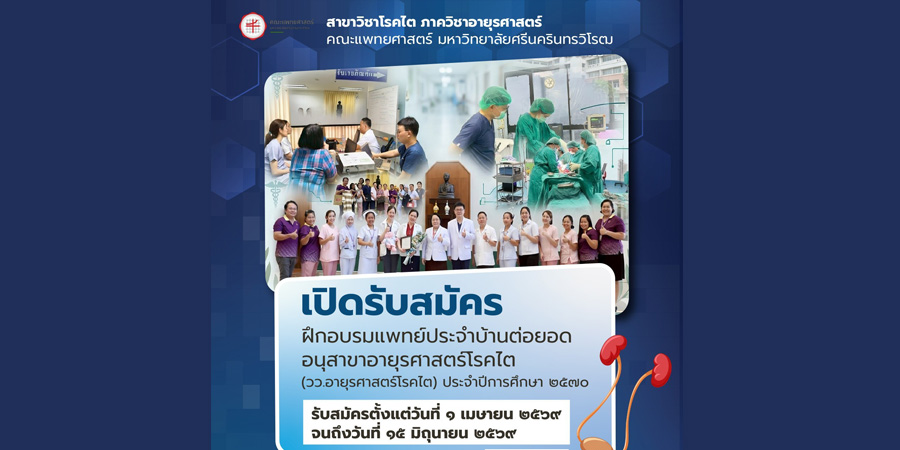 สาขาวิชาโรคไต ภาควิชาอายุรศาสตร์ คณะแพทยศาสตร์ มหาวิทยาลัยศรีนครินทรวิโรฒ เปิดรับสมัครฝึกอบรมแพทย์ประจำบ้านต่อยอด อนุสาขาอายุรศาสตร์โรคไต ตั้งแต่บัดนี้จนถึงวันที่ 15 มิถุนายน 2569